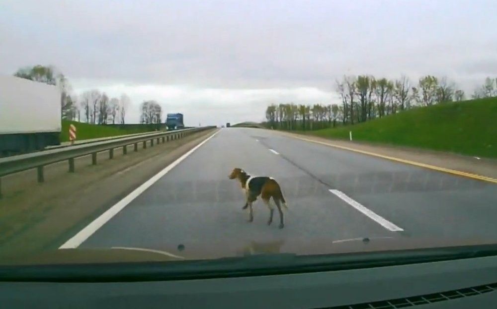 Собака внезапно выбежала на дорогу и водитель автомобиля с видеорегистратором решил её пожалеть. А дальше случилось что-то непонятное и какое-то всеобщее помешательство и кретинизм.