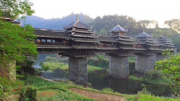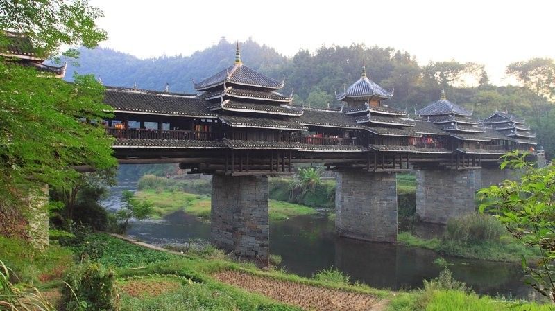 В живописном регионе Гуанси-Чжуан, недалеко от города Лючжоу, перекинут через воду мост Юнцзи - удивительное сооружение, где китайские традиции переплетаются с инженерной смекалкой. Построенный между 1912 и 1924 годами, он стал воплощением мастерства народа дун, известного своими уникальными деревянными постройками без единого гвоздя.Длина моста 76,6 метра, ширина всего 3,75 метра, а высота над водой достигает 20 метров. Основание формируют массивные каменные опоры, выдерживающие течение реки и сезонные паводки. Главное украшение - двухъярусная крыша с изогнутыми скатами, резными карнизами и пятиярусными пагодами, напоминающими храмовые башни.Это не просто мост, а многофункциональное пространство. Под его крышей путники укрываются от дождя, местные жители отдыхают, а туристы любуются пейзажами.
