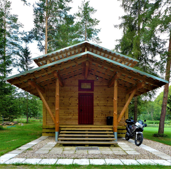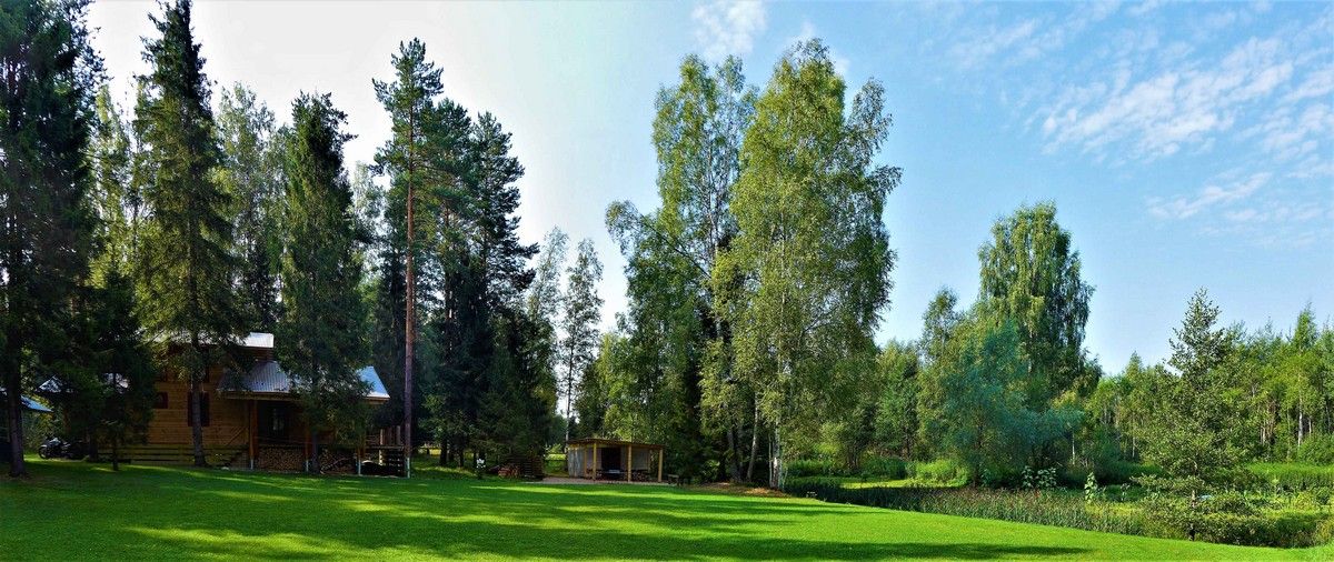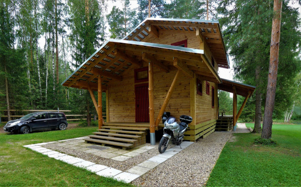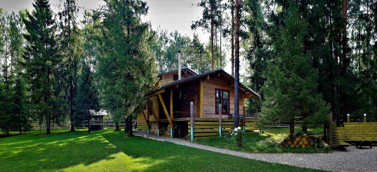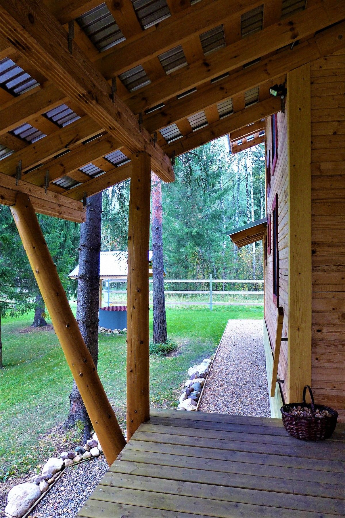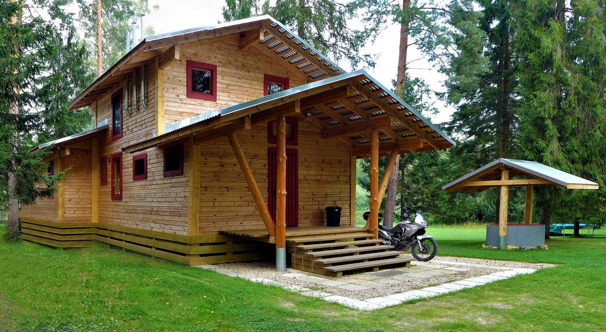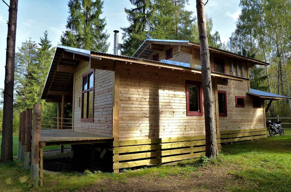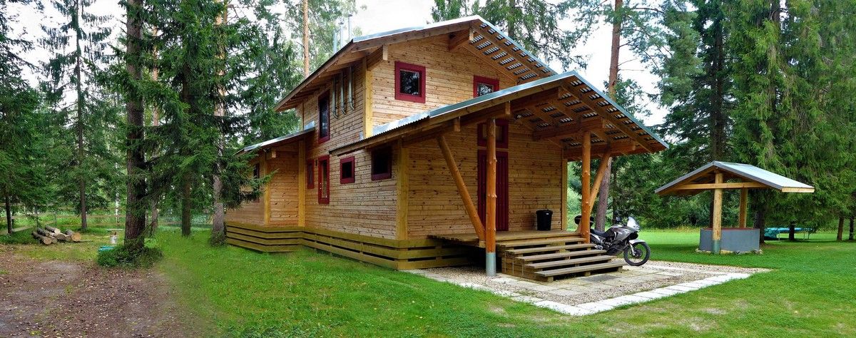 Участок в лесу с поляной и протекающим по границе ручьем дал возможность вписать дом между существующими деревьями, разместить открытую часть террасы в сторону юга, а часть под навесом на запад в сторону естественной поляны с видом на ручей. Дом площадью 102 квадратных метра выполнен из бруса, на свайном фундаменте с совмещенной кровлей и террасой 42 кв. метра.Планировочные и стилистические решения разработаны по пожеланиям заказчиков. Дом построен в традициях деревянного домостроения с использованием как профилированного бруса, так и местных цельных стволов, используемых в проекте как конструктивные стоечные и декоративные элементы. На первом этаже распложены тамбур-прихожая с окнами, лестничный холл с естественным светом, кухня, санузел, гостевая комната, а также гостиная с камином и выходом на террасу, находящуюся под навесом со отдельным выходом на участок. На втором этаже - холл с гардеробной зоной и две спальни.