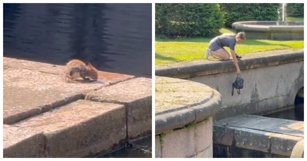 У Морского канала в Петербурге прохожие всеми силами пытались выловить из воды бельчонка