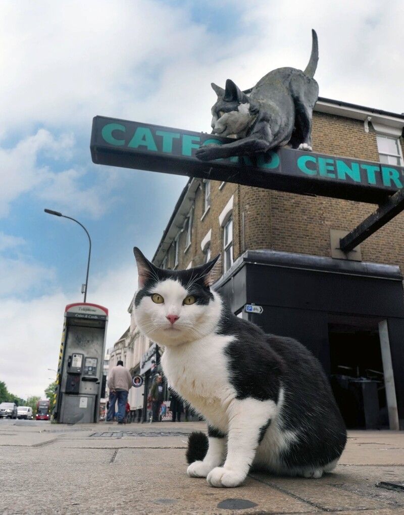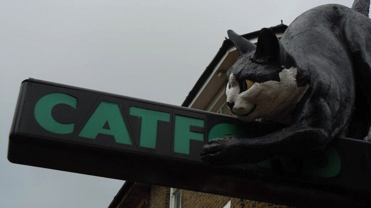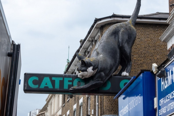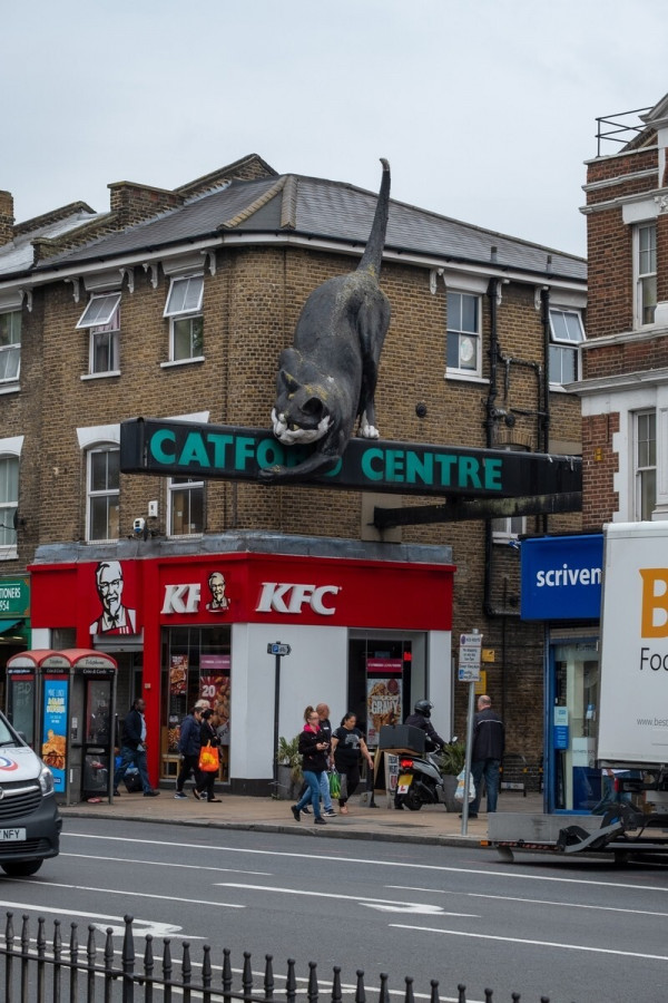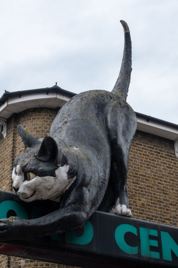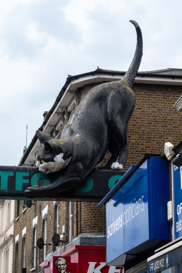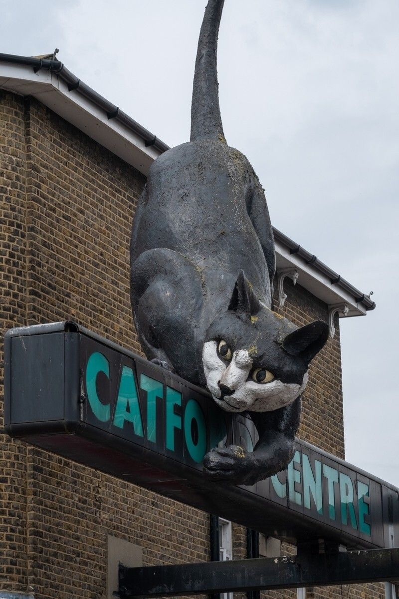 Этот огромный стеклопластиковый кот, примостившийся на здании Catford Centre, стал символом района. С 1974 года он безмятежно восседает на фасаде, положив лапу на букву F в названии Catford, словно подчёркивая свою власть над территорией.