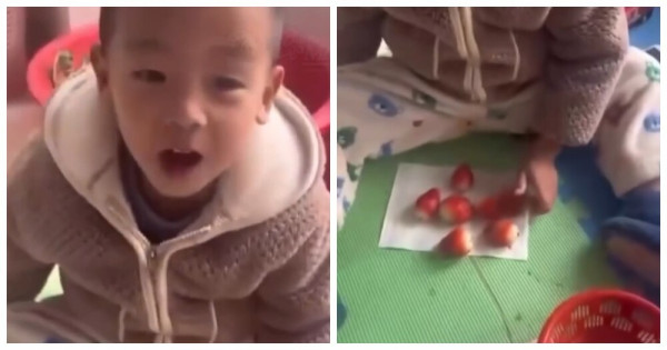 Мама принесла клубнику, и ребёнок, с ангельской справедливостью в глазах, разделил её поровну.