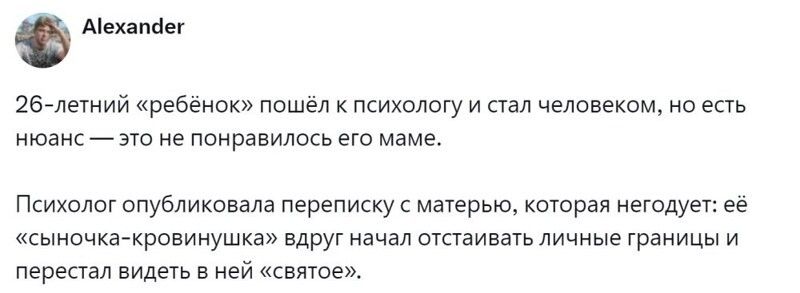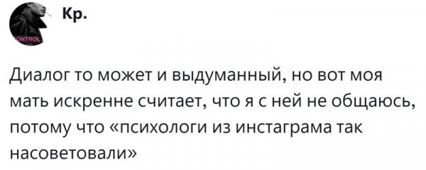 Но сегодня не обязательно читать классиков, чтобы разобраться с семейными конфликтами. Ведь есть психологи на любой вкус и кошелёк. Правда, возникает новая проблема: отбившиеся от рук детки после науськивания специалиста вообще перестают прислушиваться к родителями. Такую ситуацию разобрали пользователи и посмеялись, посчитав историю довольно грубым фейком. Но, несмотря на это, у многих нашлись и реальные примеры из жизни, во многом напоминающие фейковую историю.