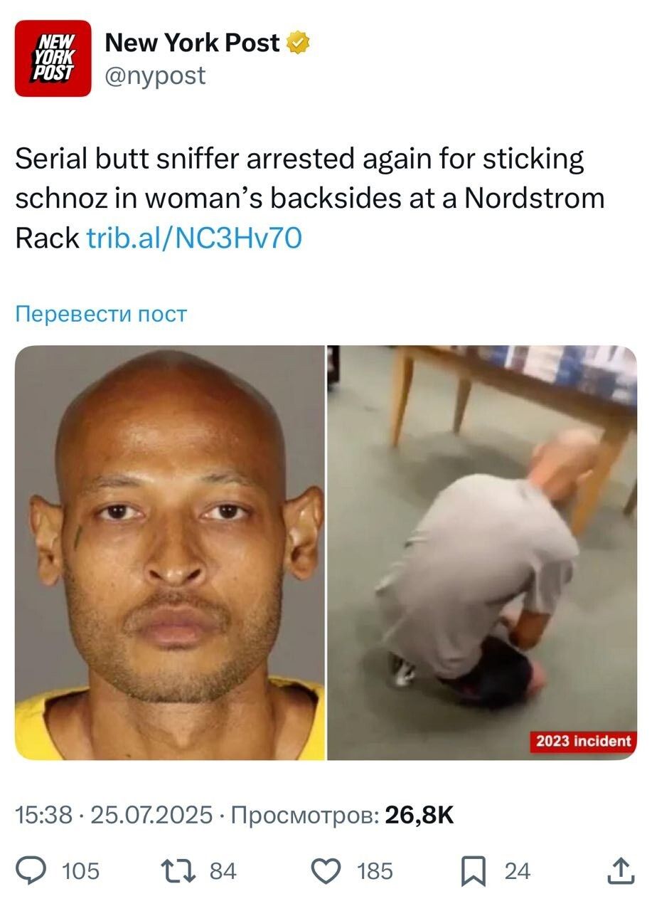 Пока мы обсуждаем экс-мэра Владивостока, трюки из интернета и названия для сериала про АвтоВАЗ, Калифорния живёт по своим законам. Там, среди полок с джинсами и стеллажей с нижним бельём, шныряет человек-легенда. Его зовут Калес Каррон Краудер, ему 36 лет, и он нюхает чужие задницы. Не ради науки. Ради... хобби, видимо.