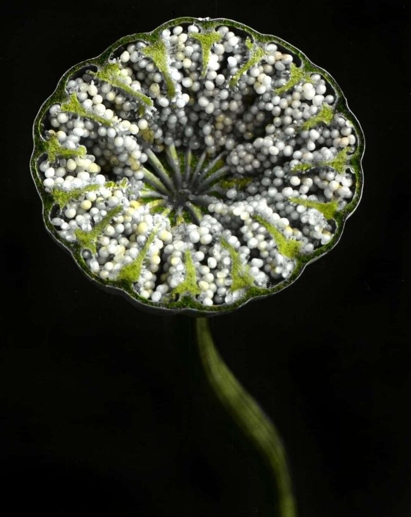 Разрезанная пополам коробочка мака похожа на миниатюрную космическую станцию, где каждая деталь продумана природой до мелочей.