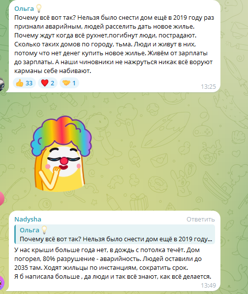 В доме продолжали жить собственники, которые не могли продать квартиры даже за копейки, а купить новые у людей не было средств.Как пишет Mash, "жильцы рухнувшего аварийного дома в Астрахани продавали свои квартиры в пять раз дешевле рынка - чтобы выручить хоть какие-то деньги и не остаться ни с чем. В прошлом году две однушки ушли буквально за бесценок - за 750к и за 1 млн". Один из собственников жилья в этом доме рассказал РБК о состоянии здания: "Дом убитый. Я когда по нужде туда ходил, поднимался с опаской, потому что мой первый подъезд был весь на соплях. В стенах - огромные трещины, и казалось, что дом развалится от любого чиха", - поделился мужчина.После того как здание все-таки получило статус аварийного, жильцов не расселили до конца - лишь часть из них получили муниципальное жилье- те, кто не являлся собственниками квартир. А те жильцы, квартиры которых были приватизированы, должны были получить компенсацию в 1,7 млн руб., но половина владельцев жилья ждут обещанные выплаты с зимы, и выехать им было некуда. Между тем, люди сообщали о том, что подвал дома был полностью затоплен сточными водами, на стенах были трещины, а фундамент осел. В подъезде стояла вода, но "Водоканал" на жалобы не реагировал. Утечки газа в доме не было, поэтому обрушение могло произойти из-за подмыва и разрушения фундамента.Сейчас на месте обрушения работают спасатели, которые разбирают завалы. Периодически объявляют минуту тишины, чтобы услышать, есть ли под завалами люди.В ряде СМИ писали о трёх пострадавших, но официально это не подтверждено. Якобы госпитализирован был только один маломобильный житель соседнего подъезда, и то - из-за стресса. Известно о 15 эвакуированных жителях дома. ПВР сейчас открыт в СОШ №8, людям оказывается психологическая помощь = об этом сообщил глава региона Игорь Бабушкин.