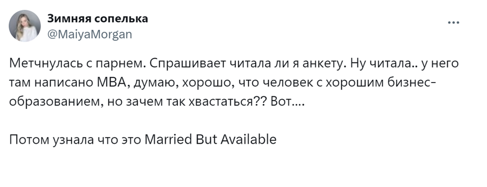 MBA (master of business administration) - магистр делового администрирования. Married but available - женат, но доступен.