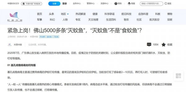 В пруды и канавы парков Фошаня выпустили более 5 тысяч особей гамбузии, мелкой, но прожорливой рыбёшки, способной в день уничтожать до 200 личинок комаров. По оценке специалистов, за три месяца популяция личинок должна снизиться на 60%. Причём всё это, по идее, без вреда экосистеме, без химии, без запаха и без угрозы для кошек, которые пьют воду из канав. В районе Чанчэн, там, где реализуется схема, с момента запуска рыбопропуска прошла пара недель, и результаты уже показывают снижение плотности комаров и личинок в 78 % населённых пунктов и деревень.Гамбузия - не новинка. Эти рыбки давно применяются в Азии и Южной Америке для борьбы с малярийными комарами. Но выпуск их в город в масштабах "маленькой биологической армии" это шаг новый.