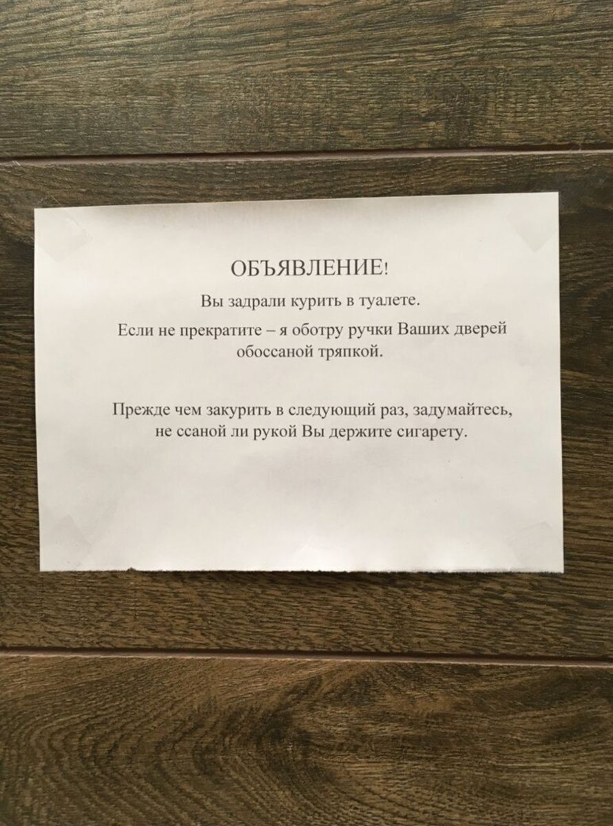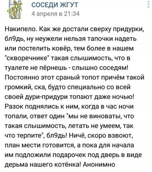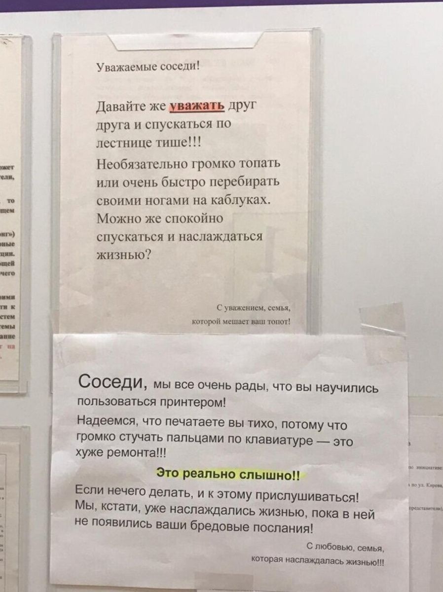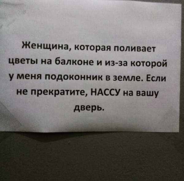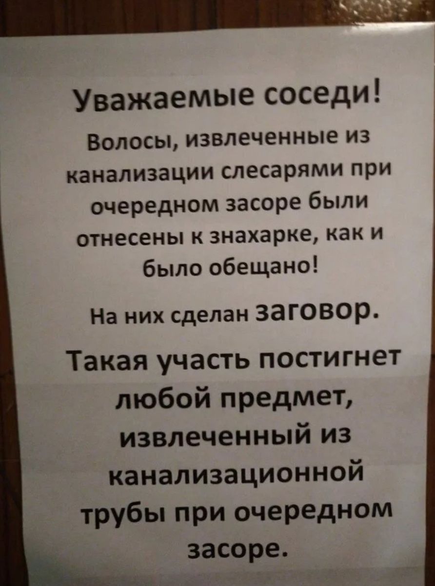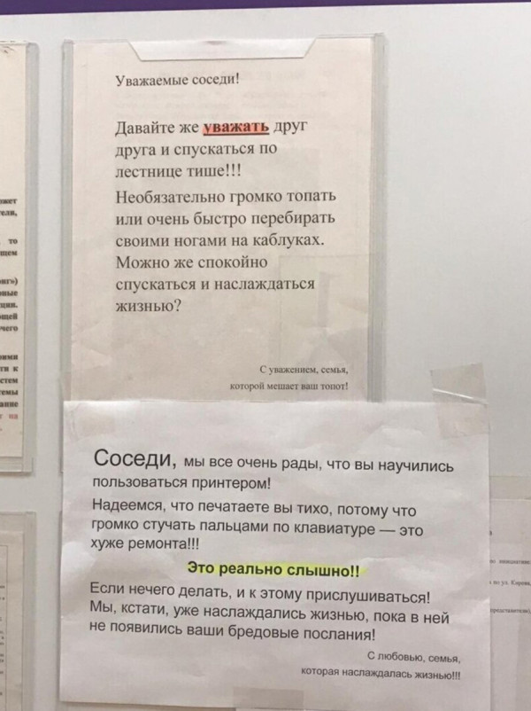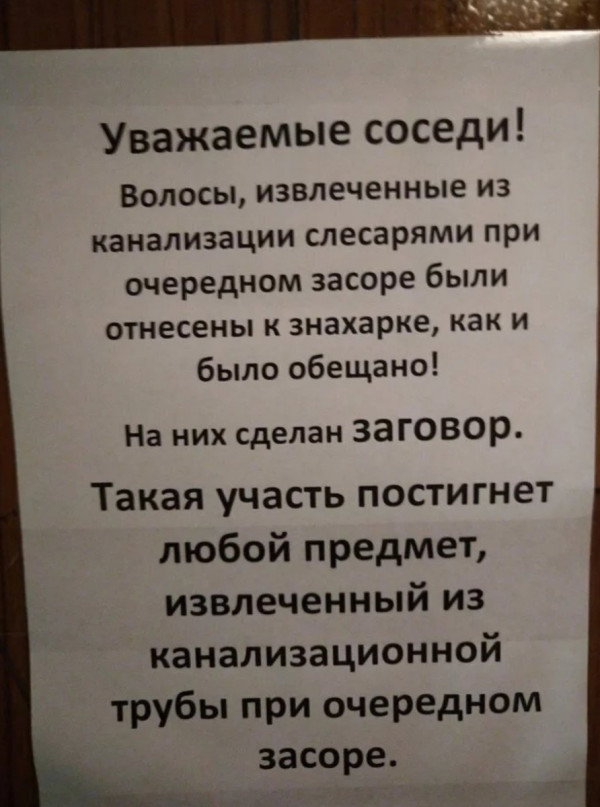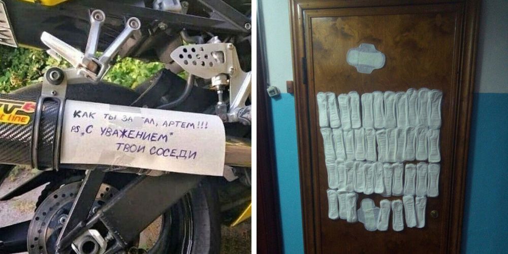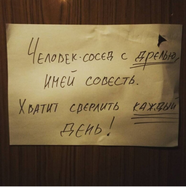 Соседи, доведенные до отчаяния, страшная сила - они могу устроить устроить настоящий террор, но как вежливые люди, сначала напишут предупреждение...