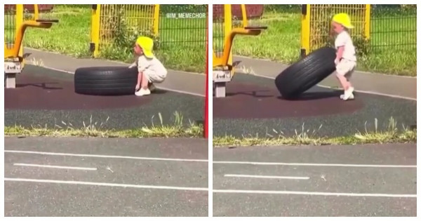 На игровой площадке малыш изо всех сил пытался сдвинуть с места большую автомобильную шину. Видно было, что она намного превосходит его по размеру и весу. Однако после долгих мучений, он все же смог осуществить задуманное.