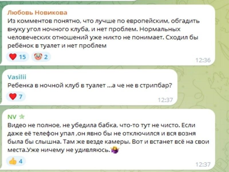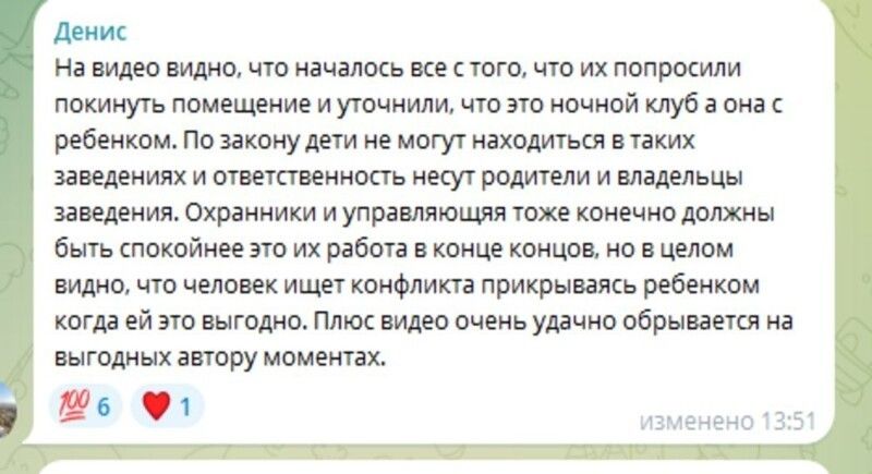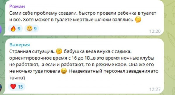 Пользователи соцсетей, обсудив ситуацию, во мнениях разделились. Одни посчитали женщину провокаторшей, потребовавшей, чтобы сотрудники ночного клуба нарушили инструкции, другие уверены, что охранник сам создал проблему: пустил бы мальчика на 5 минут в туалет - и дело с концом. Никакого бы конфликта не было.