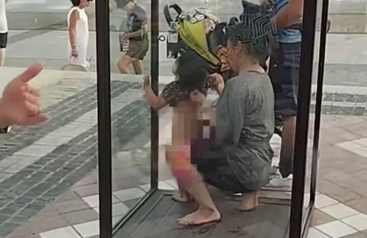 На кадрах видно, как мать на корточках переодевает ребёнка - сначала снимает шорты, после чего малыш некоторое время стоит без одежды ниже пояса. Затем женщина надевает вещи обратно и уводит его.Сцена разворачивается буквально в паре метров от памятника генерал-майору, при этом прозрачные стены кабинки позволяют видеть всё происходящее. По словам свидетелей, вокруг в этот момент находилось немало прохожих.