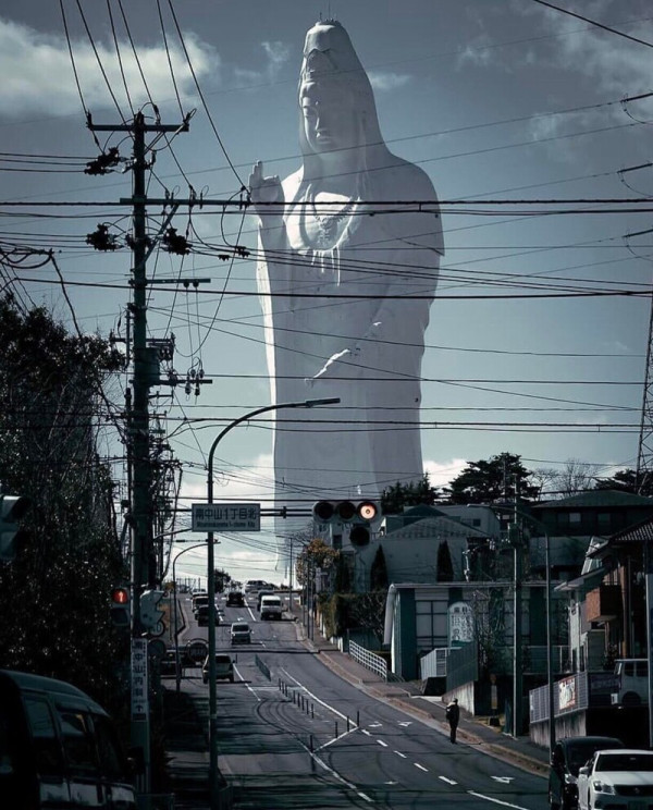 Столь впечатляющий снимок демонстрирует одну из самых высоких статуй мира - величественное изображение бодхисаттвы Каннон в японском городе Сэндай. Возвышаясь на 100 метров, белоснежная фигура словно парит над городом, благословляя его жителей.