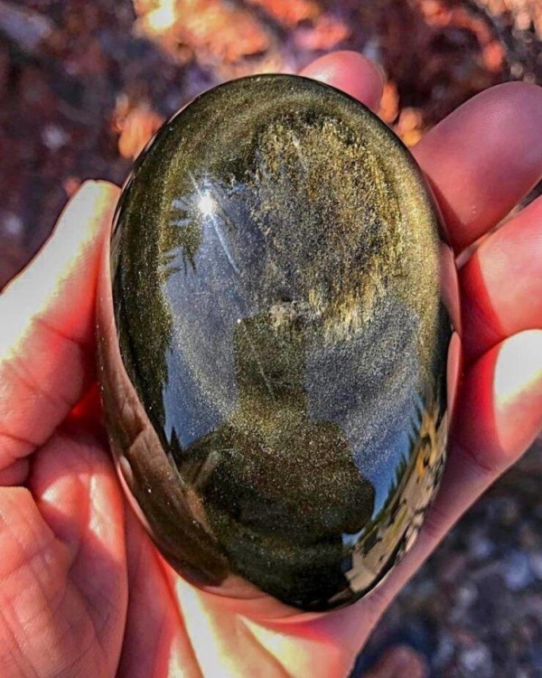 Завораживающий момент демонстрирует редкую разновидность вулканического стекла - золотистый обсидиан из Мексики. Камень словно содержит в своих глубинах жидкое солнце, переливающееся при малейшем повороте.