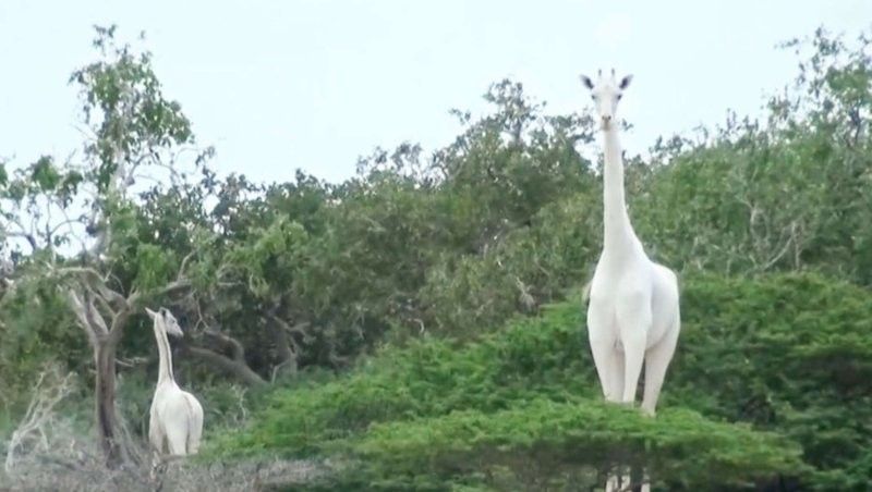 Потрясающий кадр демонстрирует невероятно редкого альбиноса среди жирафов - величественное животное с белоснежной шкурой, словно сотканное из солнечного света. На фоне золотистой африканской саванны оно выглядит как мистическое видение.