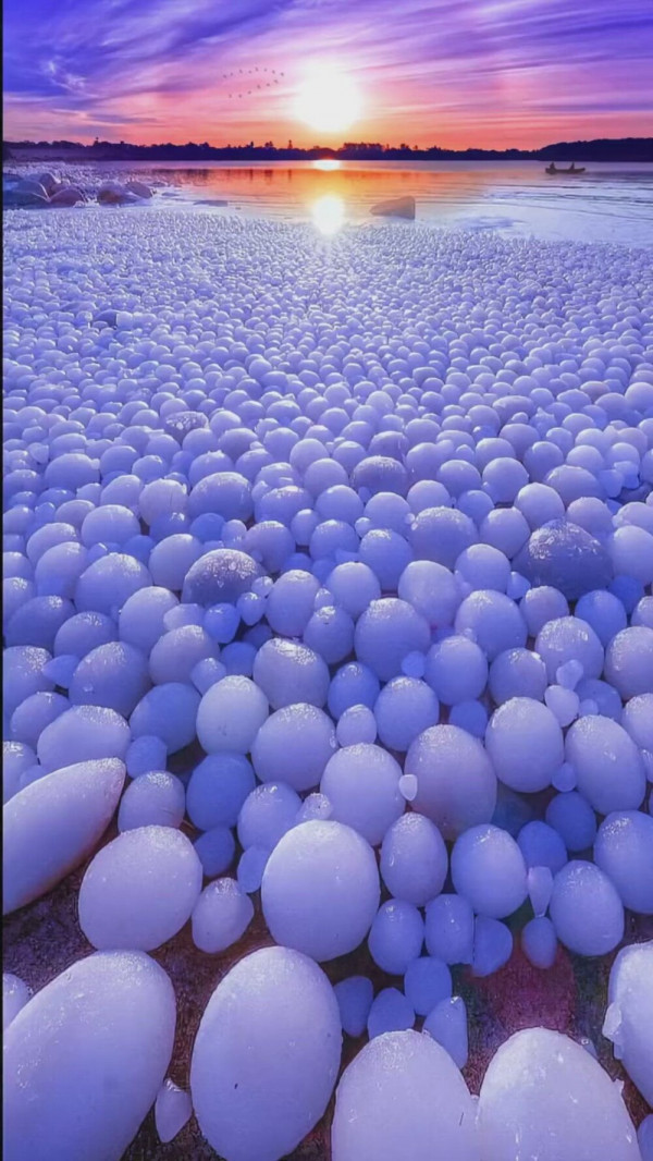 Потрясающее фото демонстрирует редкое природное явление - идеально круглые ледяные шары, выброшенные на берег в Северной Финляндии. Напоминающие гигантские жемчужины или яйца мифических существ, эти ледяные сферы созданы совместной работой ветра, воды и экстремального холода.