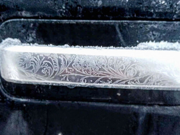 Этот удивительный макроснимок запечатлел природный шедевр - узоры инея на обычной дверной ручке грузовика в морозное утро.
