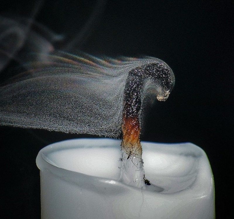 Этот трогательный снимок показывает неожиданное преображение дыма от потухшей свечи. В нём внезапно проявилась радужная игра света. Казалось бы, обычный процесс горения обернулся оптическим чудом, когда микроскопические частицы сажи преломили солнечные лучи.