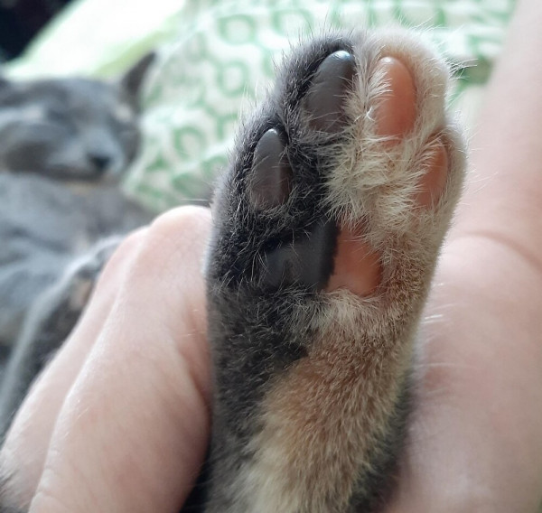 Милый снимок демонстрирует редкое явление - лапку котёнка с идеально разделённым окрасом. Как будто невидимый художник провёл кистью, создав контраст между розовыми и тёмными подушечками.