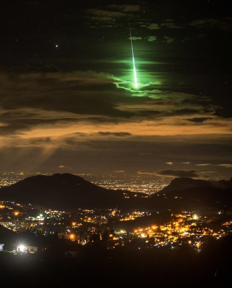 Невероятный кадр - редкое астрономическое явление - ярко-зелёный метеор, вспыхнувший в ночном небе над Индией.