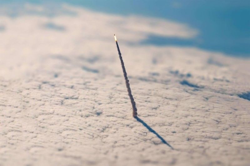 Этот потрясающий снимок запечатлел кульминационный момент космического запуска - ракету, преодолевающую границы земной атмосферы.