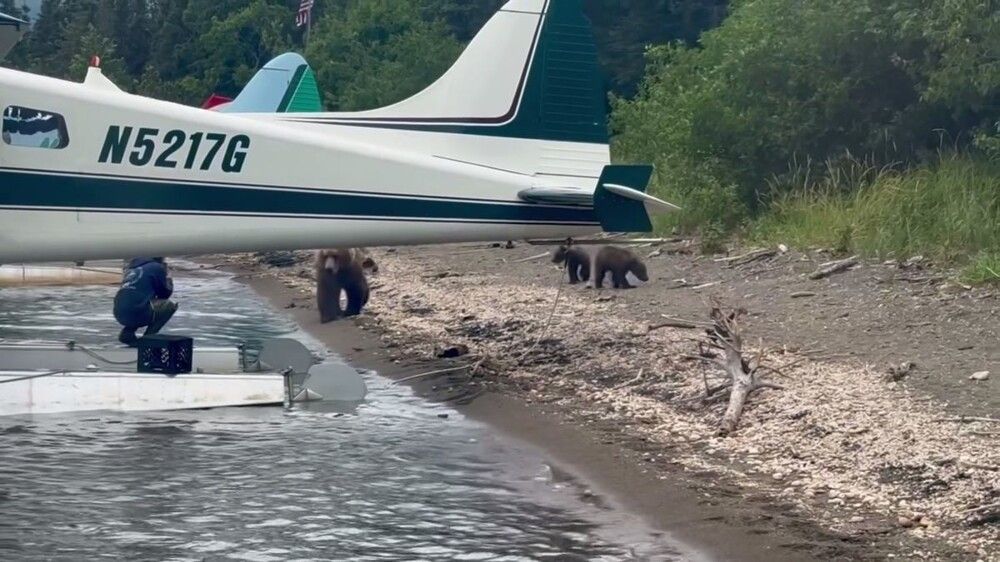 Обстановка в национальном парке Катмай на Аляске. Женщина наблюдает за медведицей и её медвежатами с очень близкого расстояния.