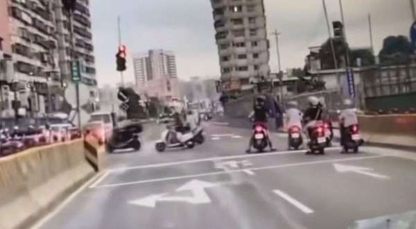 Участник дорожного движения в Тайбэе запечатлел нападение пассажира на водителя скутера. Пассажир несколько раз ударил скутериста, а затем убрал его с дороги.