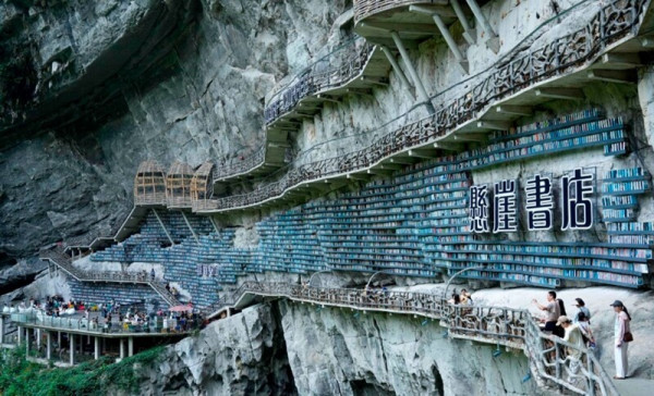 В живописной туристической зоне "Мяньхуа Тянькэн" в Китае находится необычный книжный магазин, буквально встроенный в скалу. Добираются до него по извилистым тропинкам в окружении гор.