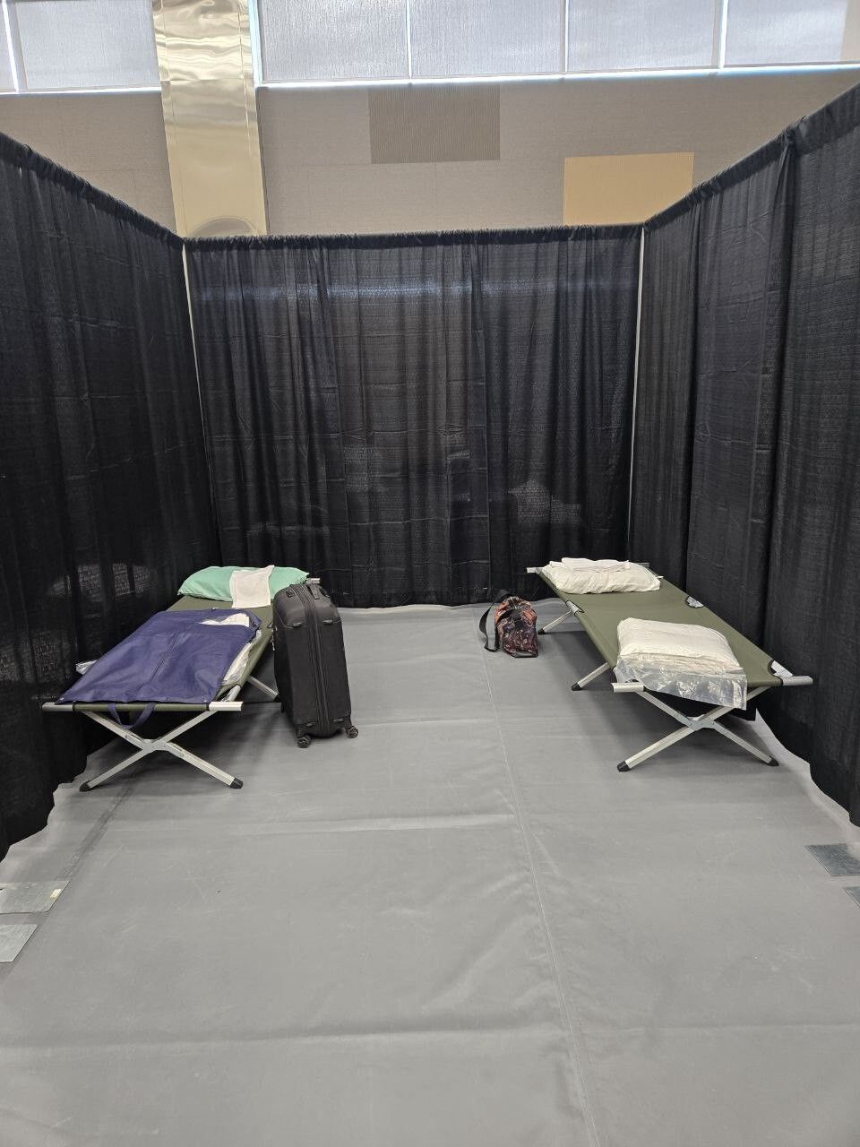 Для представителей прессы поставили ряды раскладушек с подушками и одеялами, отделяя "купе" ширмами по две койки.