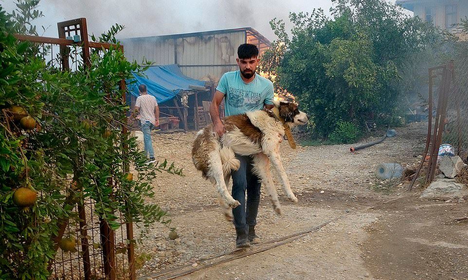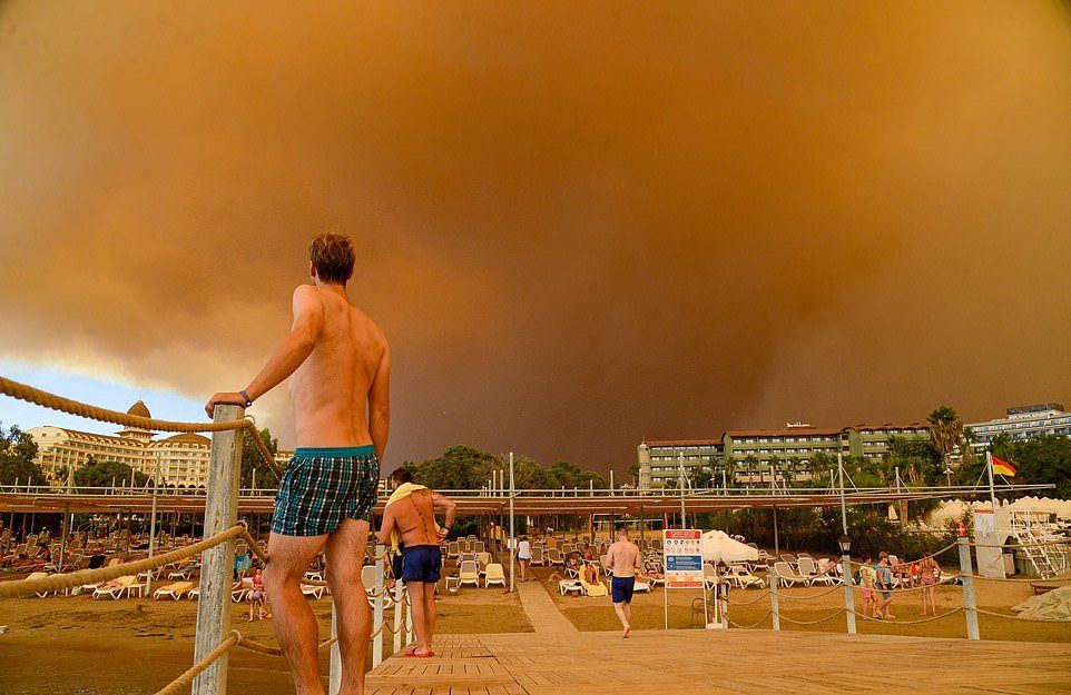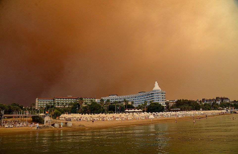 Официальные лица также начали расследование из-за подозрений в том, что пожары, вспыхнувшие в среду в четырех местах к востоку от туристической точки Анталии, были результатом поджога.Управление по чрезвычайным ситуациям Турции сообщило, что погибли три человека, в том числе 82-летний мужчина, который жил один.Позже телеканал NTV сообщил, что 25-летний мужчина погиб в Мармарисе, пытаясь доставить помощь.Пожары впервые вспыхнули в малонаселенном районе примерно в 45 милях к востоку от Антальи - курорта, особенно популярного среди российских и других восточноевропейских туристов.Но теперь они продвигаются все ближе к песчаным пляжам, усеянным отелями и курортами.Изображения в социальных сетях и турецком телевидении показывали, как жители выскакивают из своих машин и бегут, спасая свою жизнь, по задымленным улицам, освещенным оранжевым пламенем.Тяжелые клубы дыма окрасили темно-оранжевое небо над прибрежным гостиничным комплексом в городе Манавгат.По меньшей мере 183 человека были госпитализированы.Министр сельского хозяйства Бекир Пакдемирли сообщил, что отель также эвакуируется недалеко от туристического города Бодрум - примерно в 300 километрах к западу от Антальи - в связи с новыми пожарами на южном побережье.Пожары бушевали с температурой, приближающейся к 104F (40C), и порывами ветра 30 миль в час.Но мэр Антальи Мухиттин Бочек заявил, что подозревает, что пожары вспыхнули в результате поджогов, потому что они начались сразу в четырех местах.Президент Турции Реджеп Тайип Эрдоган заявил, что расследование уже начато.Для оказания помощи в тушении пожаров было направлено не менее 35 самолетов, 457 машин и 4000 человек личного состава.Российское посольство сообщило, что Москва направила три гигантских пожарных самолета, чтобы сбросить огнезащитный состав на горящие леса, чтобы сдержать пламя.Министр иностранных дел Греции Никос Дендиас заявил своему турецкому коллеге, что Греция, чьи отношения с соседом напряжены, "готова помочь в случае необходимости".Азербайджан также предложил свою помощь.