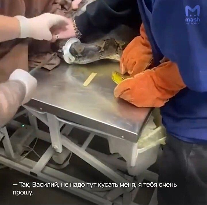 Потребовалось четверо мужчин, чтобы удержать питона на "операционном столе". Ветеринарам удалось снять кольцо и спасти пациента, не нанеся ему дополнительных травм.Вася уже вернулся в свой террариум и отдыхает на коряге.