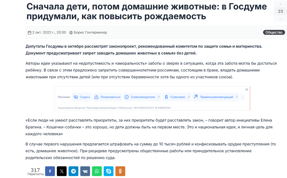 В России обсуждается инициатива по введению на федеральном уровне лимита на количество домашних животных в семье в зависимости от числа детей. С такой идеей выступил первый заместитель председателя Комиссии Общественной палаты РФ по демографии и защите семьи Павел Пожигайло.