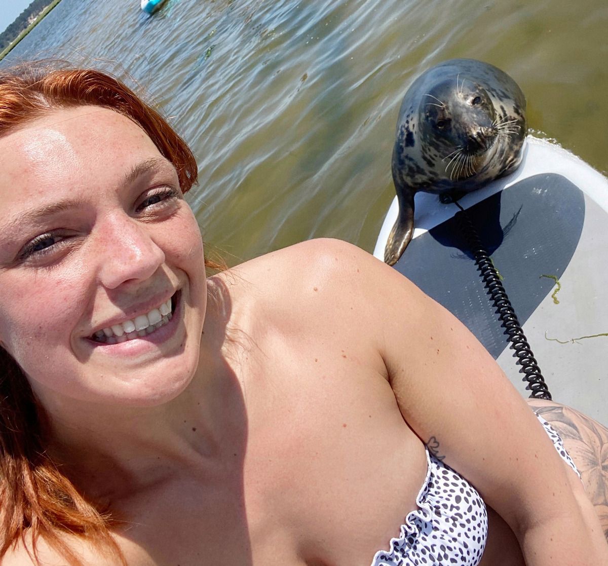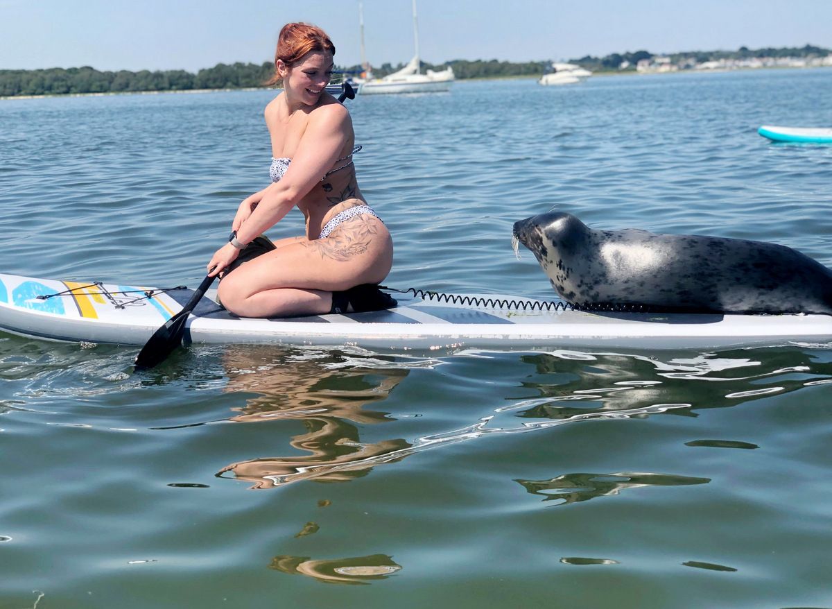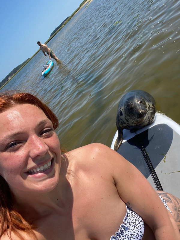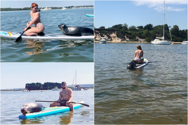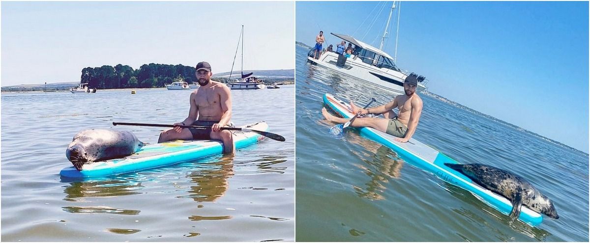 Гребцы сделали веселое селфи с тюленем, который запрыгнул на их доски и загорал, когда они плавали вокруг Дорсетского залива. Рейчел Тауэрс рассказала, что молодой тюлень подплыл к ней и запрыгнул на доску, пока она и ее друг Сэм Болл были в гавани Пула. Сначала она испугалась, что он вот-вот разорвет ее надувную доску своими острыми когтями. Но морское млекопитающее провело в их компании полчаса, спокойно греясь на солнышке.