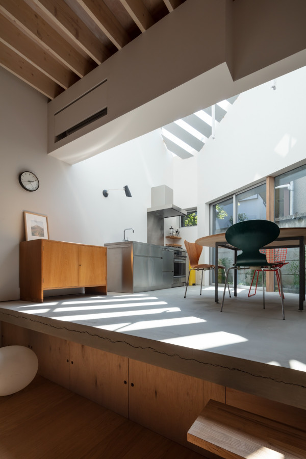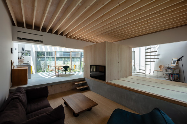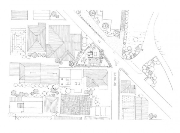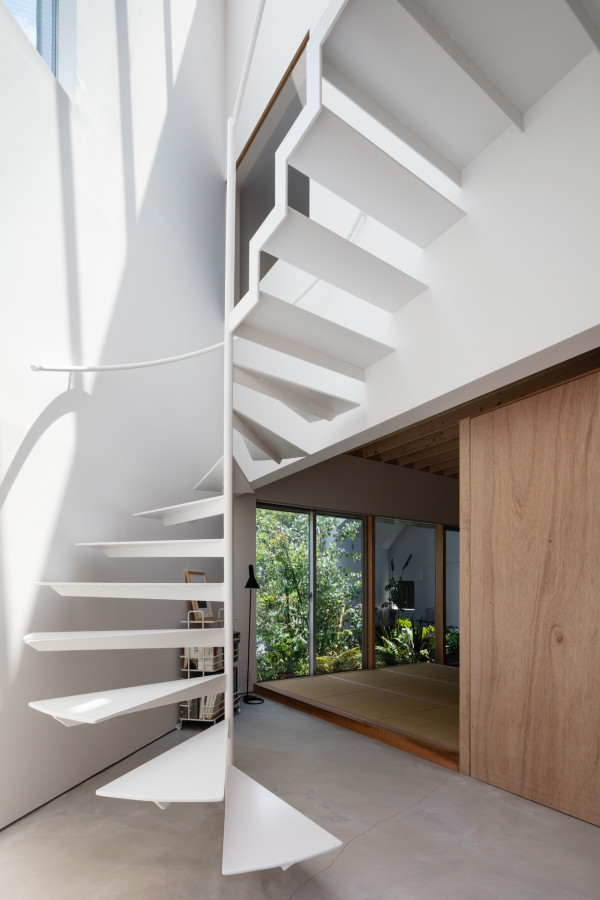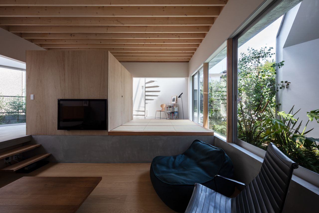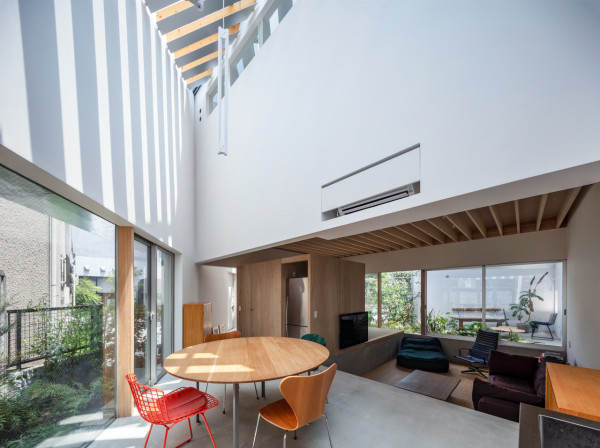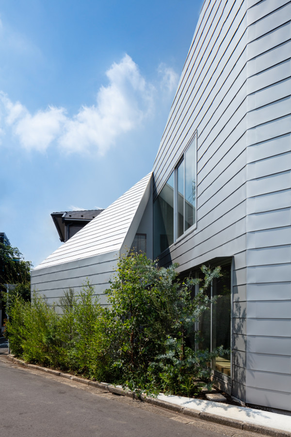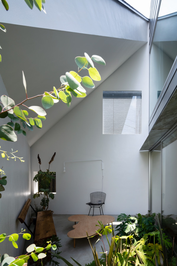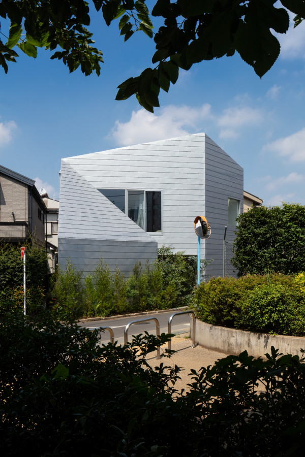 Заправляя четырехугольный объём в полутреугольную площадку, вырезаются три треугольных угла. Четырехугольный объем вмещает личные покои в верхней части, которая поднимается каркасом треугольных объёмов. Под частными помещениями неразделённая комната, включающая кухню/столовую/утопленную гостиную/полы с татами, выливается в треугольные углы, сливаясь с природными элементами за счёт щедрого остекления сверху и сбоку. Каждый из трёх треугольных объёмов отвечает городскому контексту. Восточный объём представляет собой крытую террасу с открытым садом, зажатым между восточным и четырехугольным объёмами. На террасе мало что видно, но есть намек на обитателей с улицы. Западный объём включает кухню/столовую, которая выходит на садовую полосу, ведущую к зелёным дорожкам по соседству. Северный объём формирует белое абстрактное пространство, фильтруя свет сверху.Эти три части воплощают игру дневного света, который меняется в зависимости от ритма солнца. Солнечные пятна разбросаны по всем объёмам и временами внутри кажется ярче, чем снаружи. Эта дневная драма подчёркивает впечатление перекрытия различных областей на первом этаже, размывая внутренние и внешние границы, создавая комфортное ощущение глубины и плавучести над верхней частью четырехугольного объёма. По мнению архитектора, "сад превращает жилую территорию человека в город, а ряд садов в городе представляет собой среду обитания человека". Направляя мысли обитателей в сады и за их пределы, дом поддерживает разворачивающуюся в медленном темпе их жизнь - новую жизнь на новом месте.