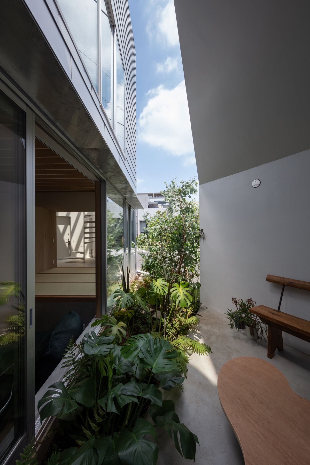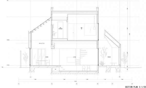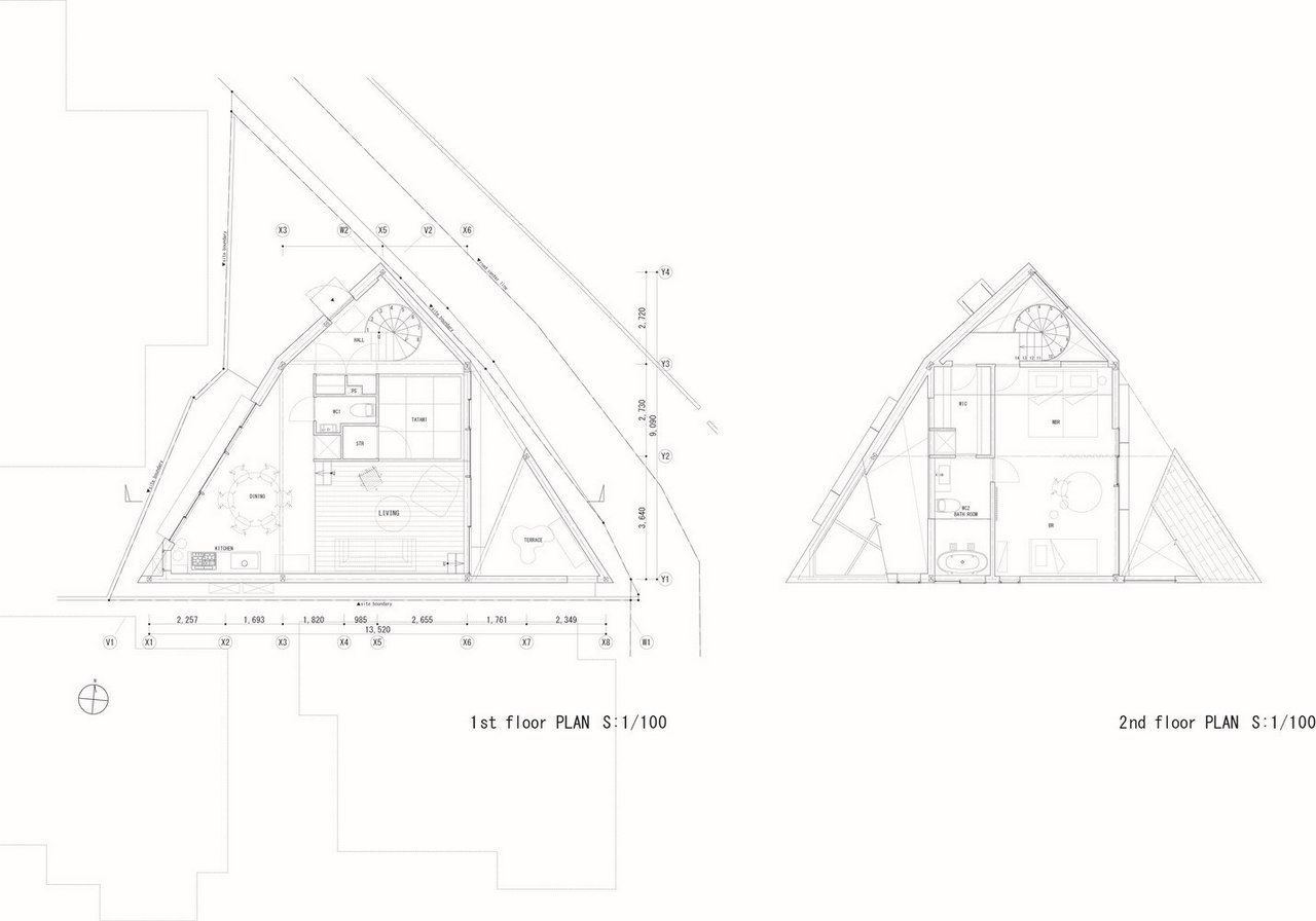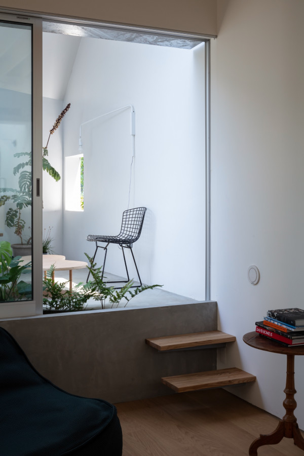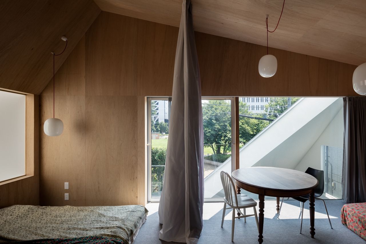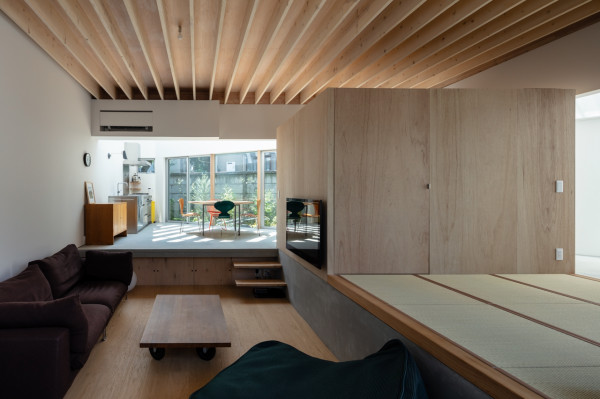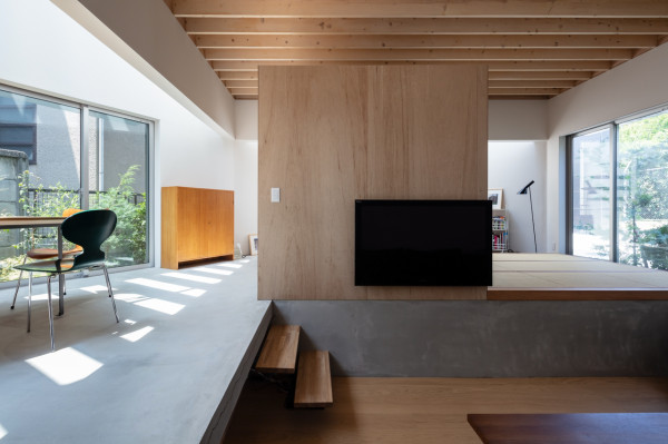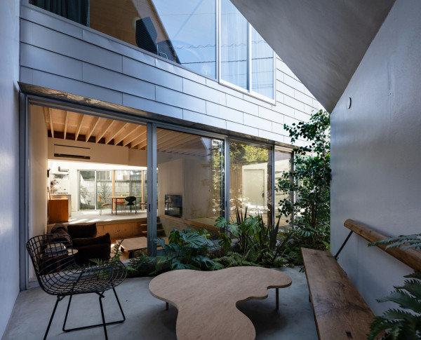 Заправляя четырехугольный объём в полутреугольную площадку, вырезаются три треугольных угла. Четырехугольный объем вмещает личные покои в верхней части, которая поднимается каркасом треугольных объёмов. Под частными помещениями неразделённая комната, включающая кухню/столовую/утопленную гостиную/полы с татами, выливается в треугольные углы, сливаясь с природными элементами за счёт щедрого остекления сверху и сбоку. Каждый из трёх треугольных объёмов отвечает городскому контексту. Восточный объём представляет собой крытую террасу с открытым садом, зажатым между восточным и четырехугольным объёмами. На террасе мало что видно, но есть намек на обитателей с улицы. Западный объём включает кухню/столовую, которая выходит на садовую полосу, ведущую к зелёным дорожкам по соседству. Северный объём формирует белое абстрактное пространство, фильтруя свет сверху.Эти три части воплощают игру дневного света, который меняется в зависимости от ритма солнца. Солнечные пятна разбросаны по всем объёмам и временами внутри кажется ярче, чем снаружи. Эта дневная драма подчёркивает впечатление перекрытия различных областей на первом этаже, размывая внутренние и внешние границы, создавая комфортное ощущение глубины и плавучести над верхней частью четырехугольного объёма. По мнению архитектора, "сад превращает жилую территорию человека в город, а ряд садов в городе представляет собой среду обитания человека". Направляя мысли обитателей в сады и за их пределы, дом поддерживает разворачивающуюся в медленном темпе их жизнь - новую жизнь на новом месте.