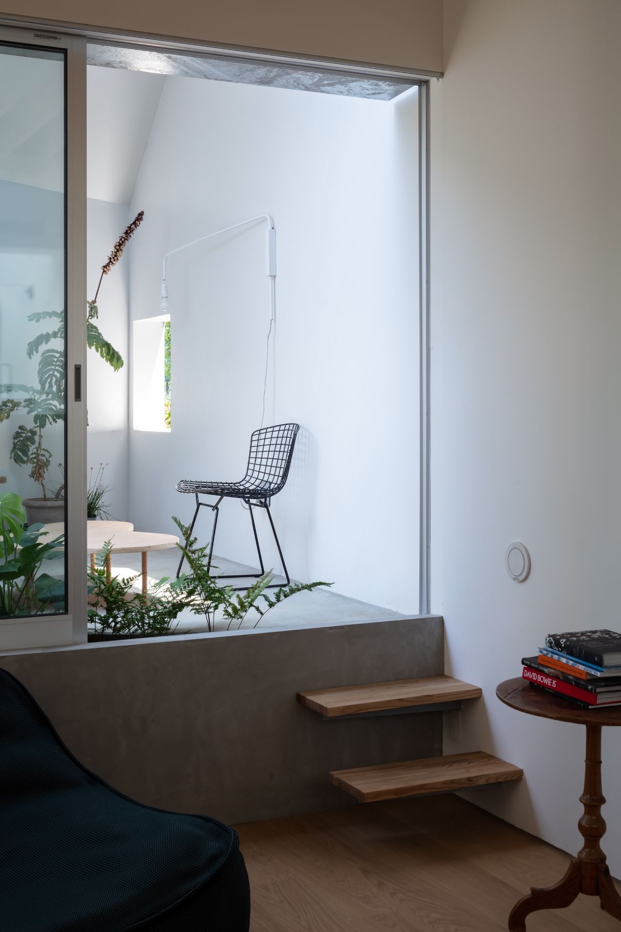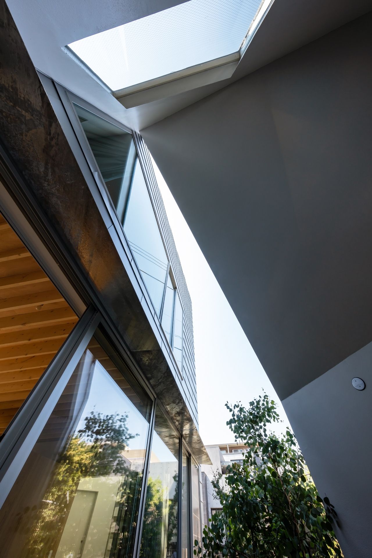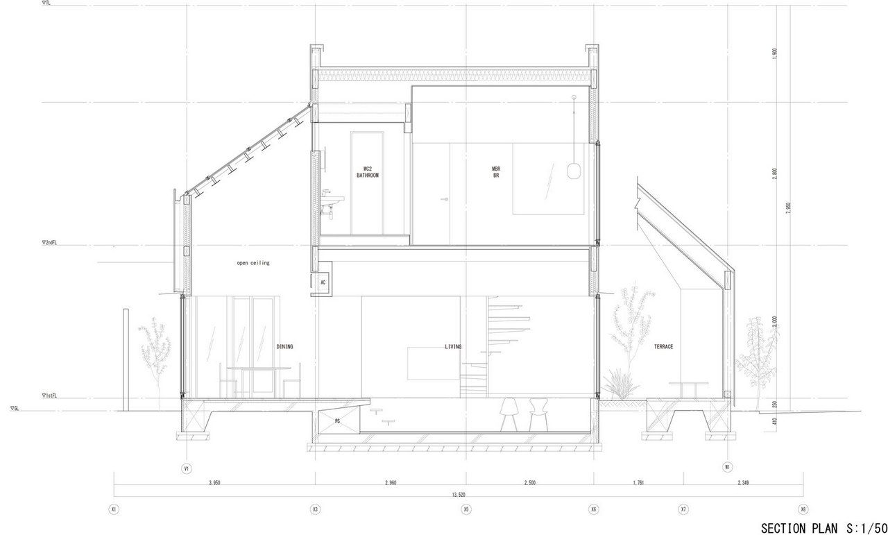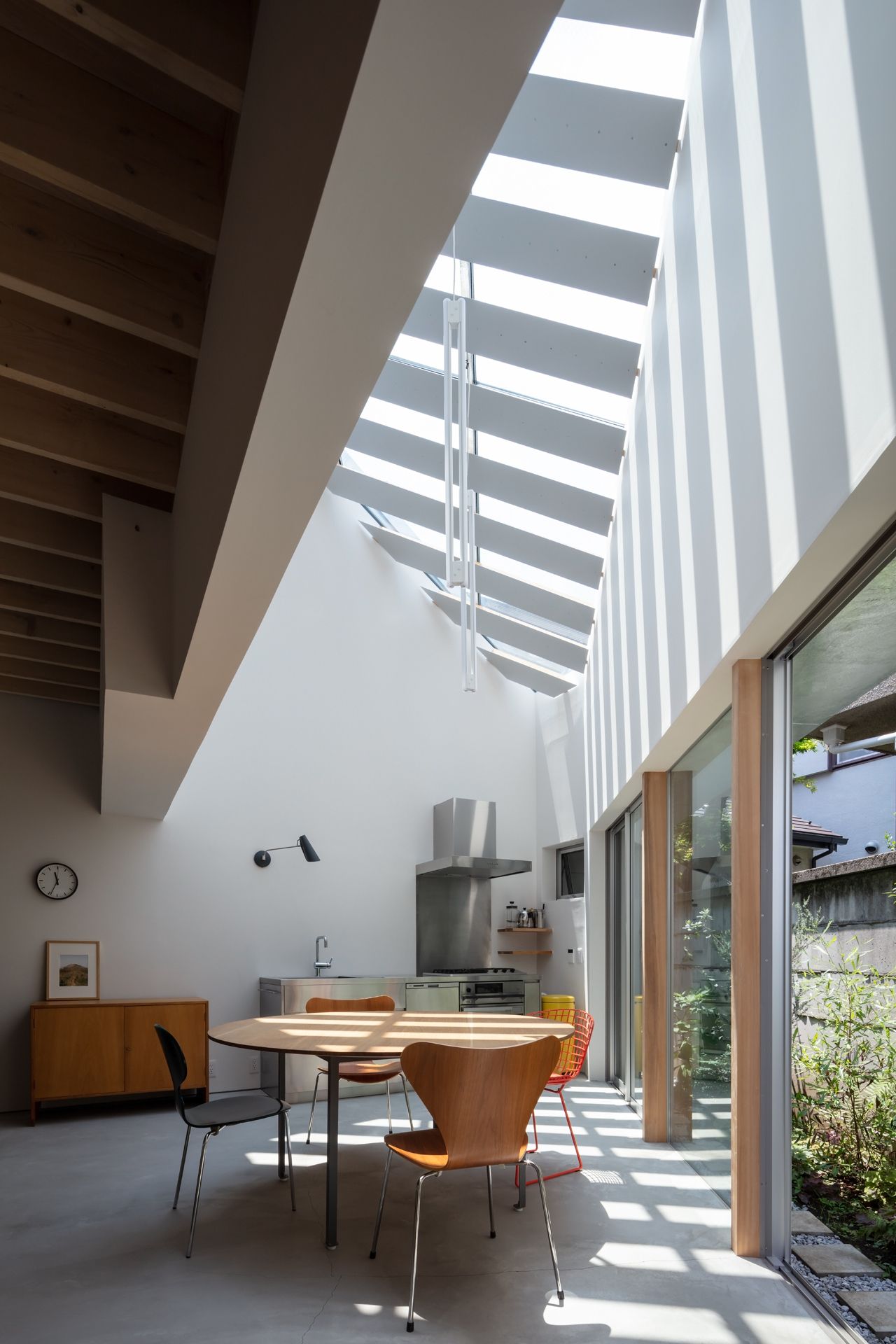 Заправляя четырехугольный объём в полутреугольную площадку, вырезаются три треугольных угла. Четырехугольный объем вмещает личные покои в верхней части, которая поднимается каркасом треугольных объёмов. Под частными помещениями неразделённая комната, включающая кухню/столовую/утопленную гостиную/полы с татами, выливается в треугольные углы, сливаясь с природными элементами за счёт щедрого остекления сверху и сбоку. Каждый из трёх треугольных объёмов отвечает городскому контексту. Восточный объём представляет собой крытую террасу с открытым садом, зажатым между восточным и четырехугольным объёмами. На террасе мало что видно, но есть намек на обитателей с улицы. Западный объём включает кухню/столовую, которая выходит на садовую полосу, ведущую к зелёным дорожкам по соседству. Северный объём формирует белое абстрактное пространство, фильтруя свет сверху.Эти три части воплощают игру дневного света, который меняется в зависимости от ритма солнца. Солнечные пятна разбросаны по всем объёмам и временами внутри кажется ярче, чем снаружи. Эта дневная драма подчёркивает впечатление перекрытия различных областей на первом этаже, размывая внутренние и внешние границы, создавая комфортное ощущение глубины и плавучести над верхней частью четырехугольного объёма. По мнению архитектора, "сад превращает жилую территорию человека в город, а ряд садов в городе представляет собой среду обитания человека". Направляя мысли обитателей в сады и за их пределы, дом поддерживает разворачивающуюся в медленном темпе их жизнь - новую жизнь на новом месте.