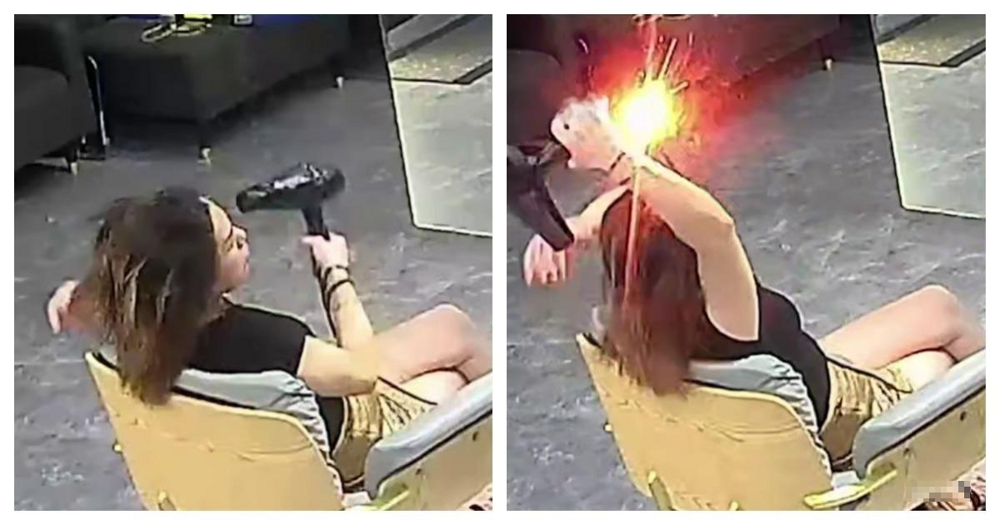 Жительница Китая сушила волосы феном, как вдруг прибор загорелся. Девушка поспешила вытащить сетевой шнур фена из розетки.