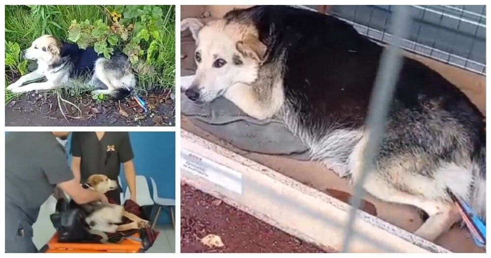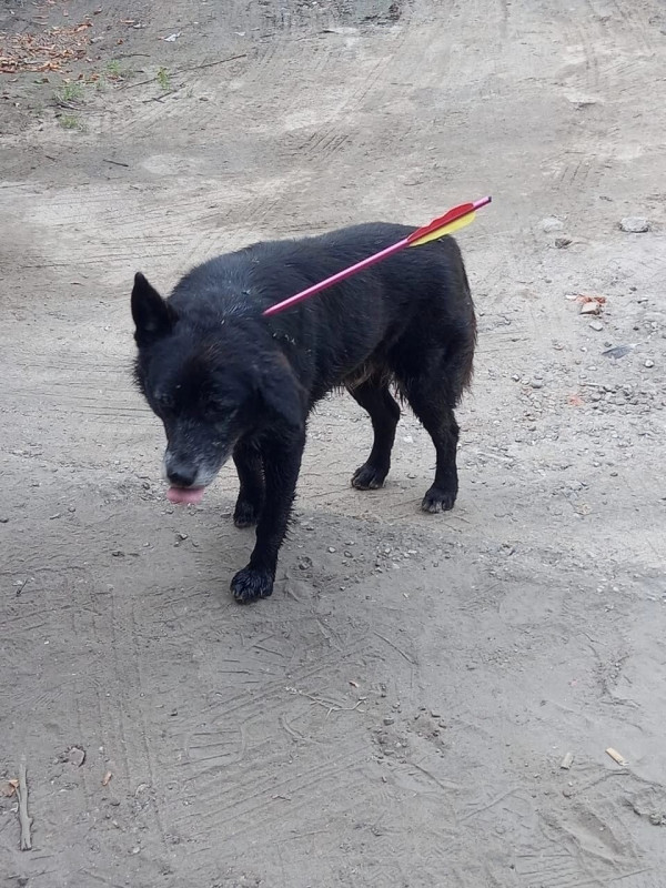 В Нелидово возле дороги была найдена беременная собака, в которую выстрелили из арбалета. Стрела вошла глубоко в тело.