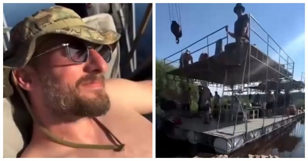 В Ленинградской области 50 мужчин собрались на большом плоту, чтобы три дня проводить время на реке Луга. В программе - отдых, костры, привалы, пиво и плов.
