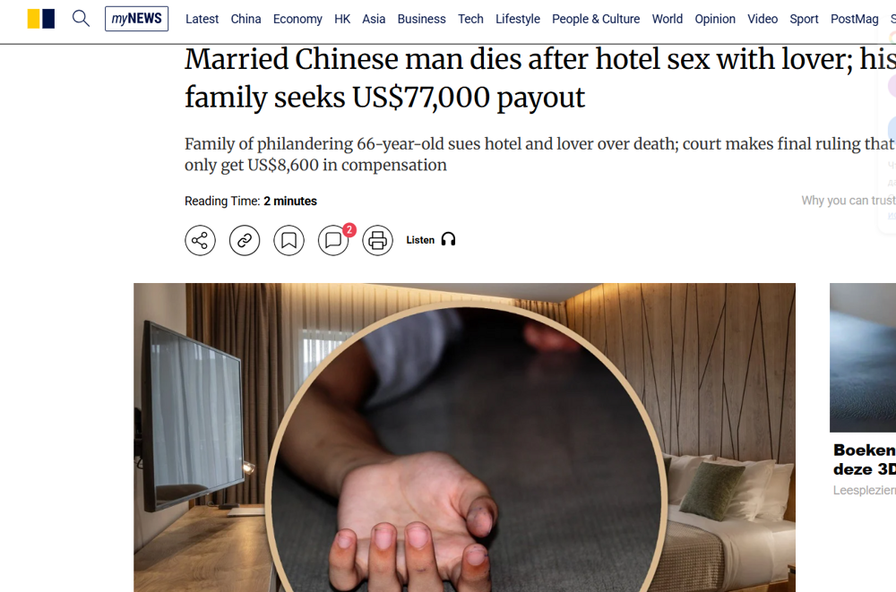 Представьте ситуацию: вы в разгар страстной встречи с любовницей в уютном отеле, и вдруг - бац, сердце не выдерживает. Именно так закончилась жизнь 66-летнего китайца по имени Чжоу, который словил острый инфаркт миокарда прямо во время секса.