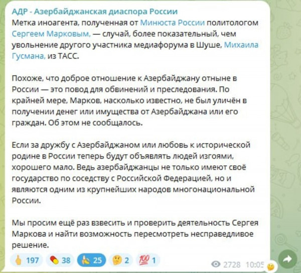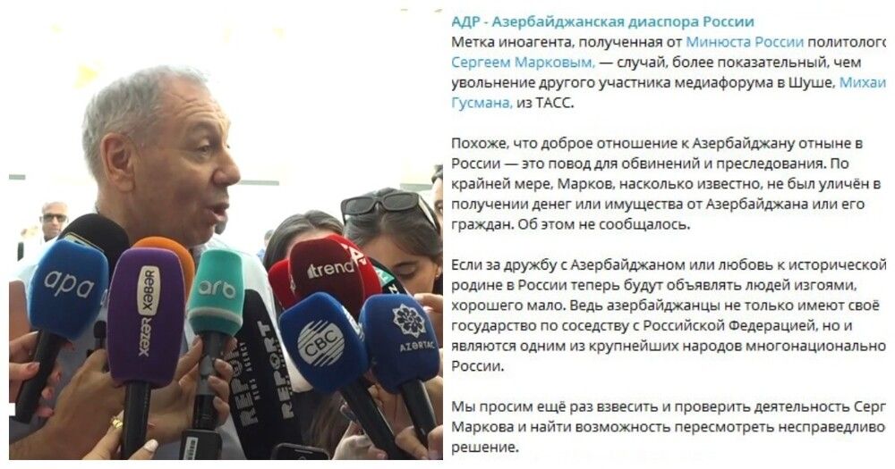 Азербайджанская диаспора России призвала Минюст пересмотреть своё решение и снять статус иноагента с российского политолога Сергея Маркова. В список иноагентов Марков попал в минувшую пятницу, там он числится под номером 1053. Как отмечали СМИ и сам политолог, он стал единственным провластным деятелем, которого признали иностранным агентом. В заявлении диаспоры говорится, что "доброе отношение к Азербайджану" сегодня в России якобы является поводом для преследования. "Марков стал мишенью для тех, кто боится правды об Азербайджане. Если сегодня в России объявляют иноагентами тех, кто говорит правду о новых центрах силы и признаёт успехи соседей, - это не клеймо для Маркова. Это приговор для самой системы, которая боится правды больше, чем врагов", - говорится в официальном заявлении диаспоры.