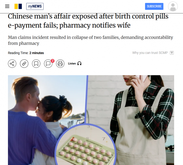 Когда мужчина из Янцзяна зашёл в аптеку, чтобы купить противозачаточные таблетки, он явно не ожидал, что этот визит изменит всю его жизнь. Цена вопроса была смешная, всего 15 юаней с небольшим. Он попытался оплатить покупку через электронный сервис, но система выдала отказ.