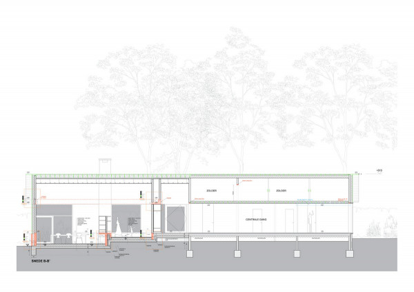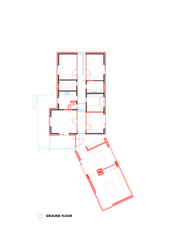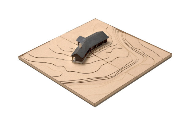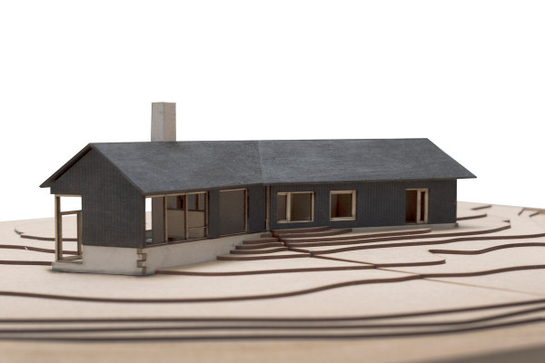Шале 60-х годов прошлого века было отремонтировано и расширено, получив новое крыло и слегка обновлённую стилистику. Архитекторы хотели избежать столкновения между старым и новым, и поэтому родилась основная идея для гармоничного расширения существующей структуры. Естественное разделение между первоначальным домом и новой пристройкой было интерпретировано как два крыла - "дневное крыло" на юге, содержащее гостиную, кухню и столовую, и "ночное крыло" на севере, содержащее спальни и ванные комнаты.