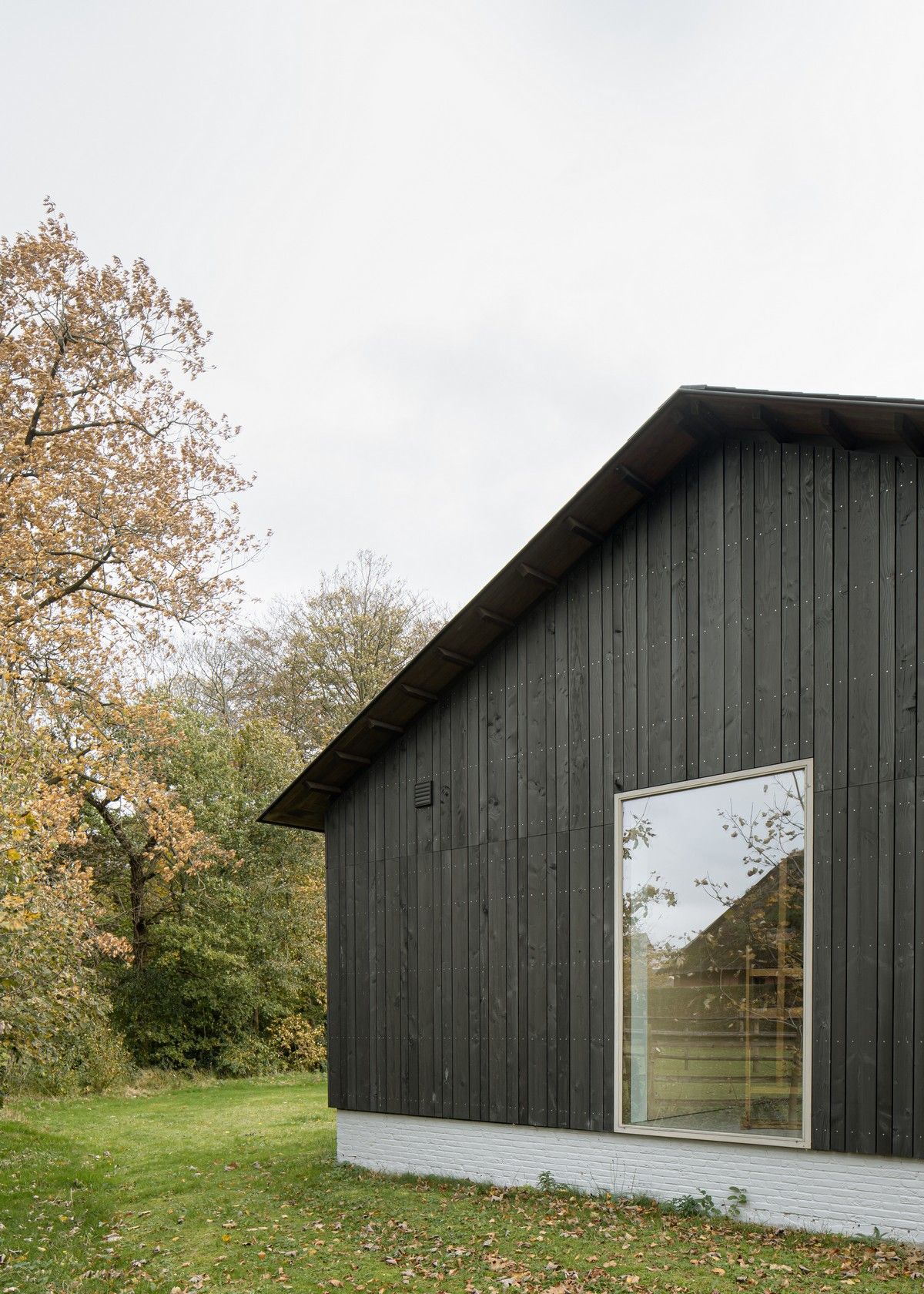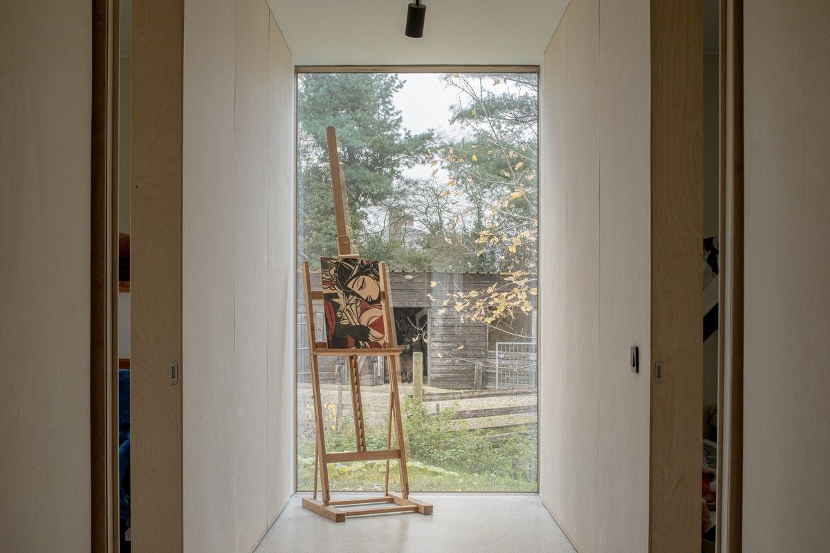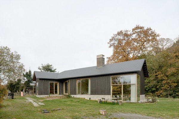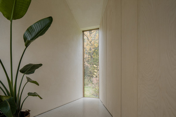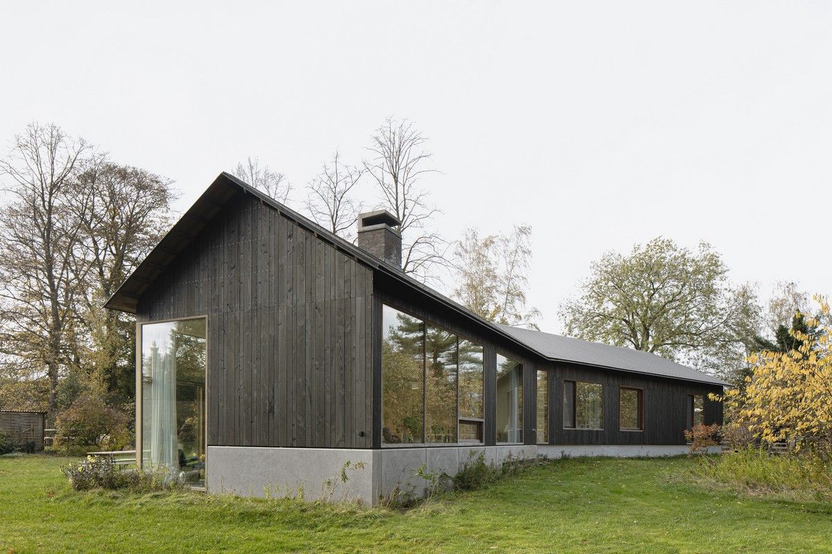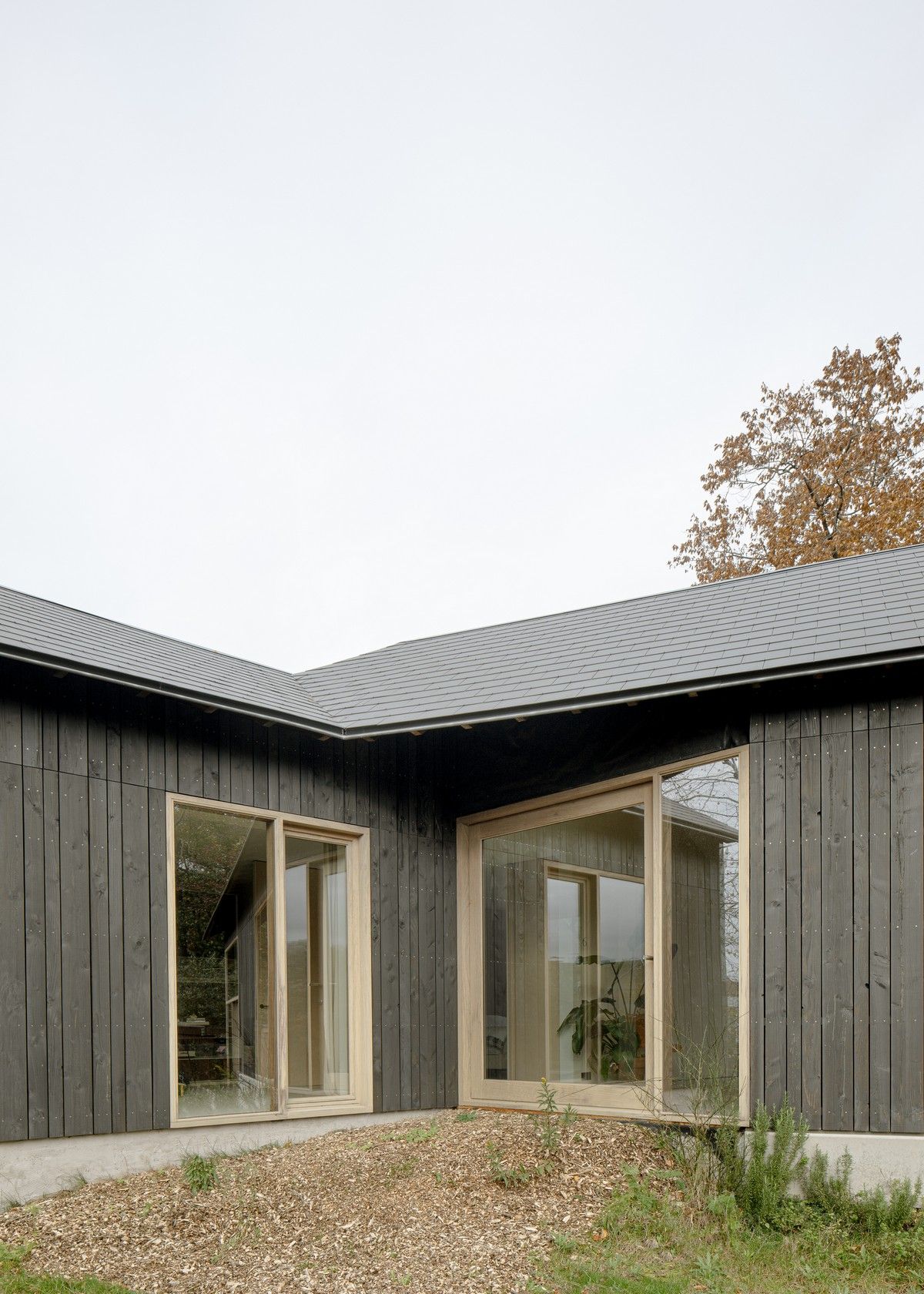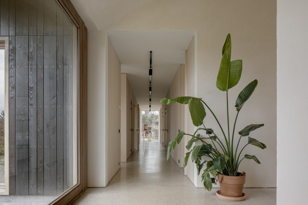 "Существующая часть превратилась в более интровертную зону, а расширение - в просторное светлое дневное крыло", - рассказали в студии. Новое крыло расположено под небольшим углом к старому, чтобы максимально увеличить угол падения солнечного света в интерьер, и в результате треугольная область между двумя крыльями образует вестибюль. Почти вся существующая часть сохранилась нетронутой, с её меньшими проёмами и более низкой высотой потолка, которые использовались для создания интимной атмосферы в ночном крыле. Наиболее драматическим изменением является новый коридор, который делит первоначальную конструкцию пополам и обрамляет виды в новое крыло. Это достаточно широкое пространство, которое можно использовать как неформальную социальную или игровую зону.Следуя пологому склону ландшафта, новое крыло переходит в утопленное бетонное основание, внешне выраженное в виде бетонного цоколя, который повторяет основу из белого кирпича первоначального шале. Это основание создаёт невысокую опору вокруг интерьера, дублируя длинные скамейки и подоконники и визуально расширяясь до центрального камина в светлом дневном крыле. Большие окна с деревянными рамами открывают вид на окружающую сельскую местность, а застеклённая часть огибает южный угол, где раздвижная дверь выходит на небольшую площадь настила. В отличие от низких потолков старого здания, двускатная крыша в новой части выражена изнутри и отделана белой штукатуркой, что еще больше подчеркивает ощущение пространства.