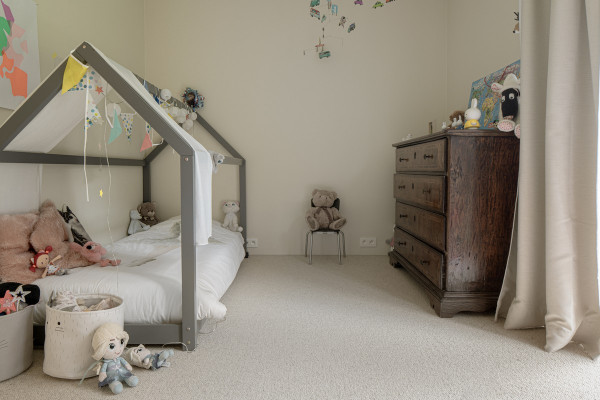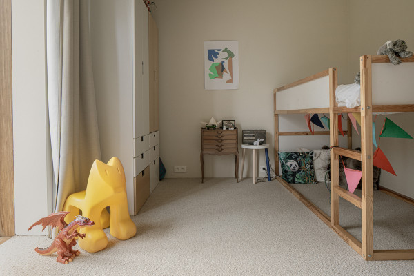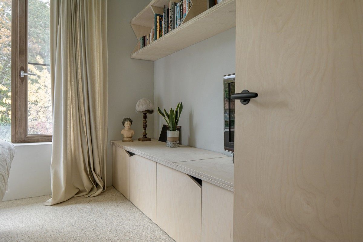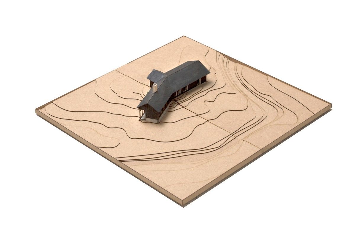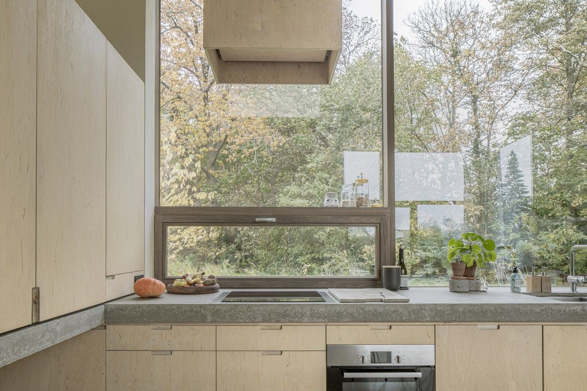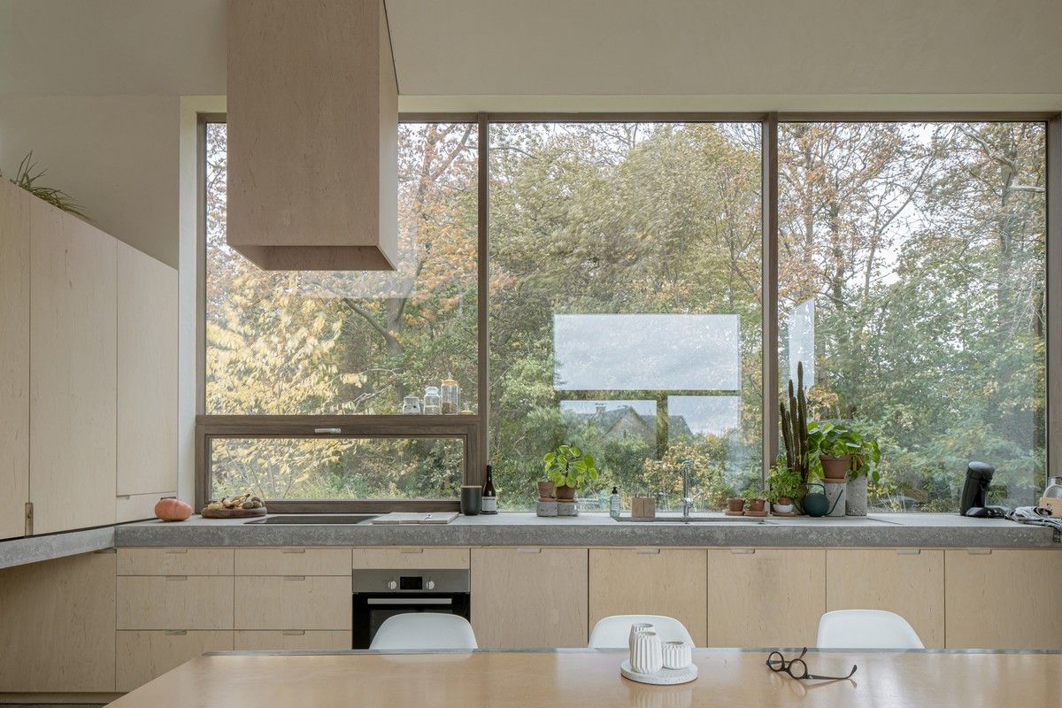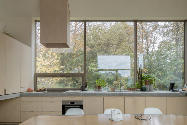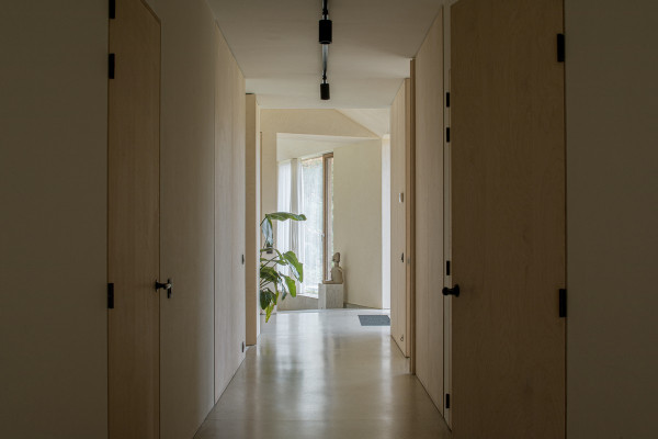 "Существующая часть превратилась в более интровертную зону, а расширение - в просторное светлое дневное крыло", - рассказали в студии. Новое крыло расположено под небольшим углом к старому, чтобы максимально увеличить угол падения солнечного света в интерьер, и в результате треугольная область между двумя крыльями образует вестибюль. Почти вся существующая часть сохранилась нетронутой, с её меньшими проёмами и более низкой высотой потолка, которые использовались для создания интимной атмосферы в ночном крыле. Наиболее драматическим изменением является новый коридор, который делит первоначальную конструкцию пополам и обрамляет виды в новое крыло. Это достаточно широкое пространство, которое можно использовать как неформальную социальную или игровую зону.Следуя пологому склону ландшафта, новое крыло переходит в утопленное бетонное основание, внешне выраженное в виде бетонного цоколя, который повторяет основу из белого кирпича первоначального шале. Это основание создаёт невысокую опору вокруг интерьера, дублируя длинные скамейки и подоконники и визуально расширяясь до центрального камина в светлом дневном крыле. Большие окна с деревянными рамами открывают вид на окружающую сельскую местность, а застеклённая часть огибает южный угол, где раздвижная дверь выходит на небольшую площадь настила. В отличие от низких потолков старого здания, двускатная крыша в новой части выражена изнутри и отделана белой штукатуркой, что еще больше подчеркивает ощущение пространства.