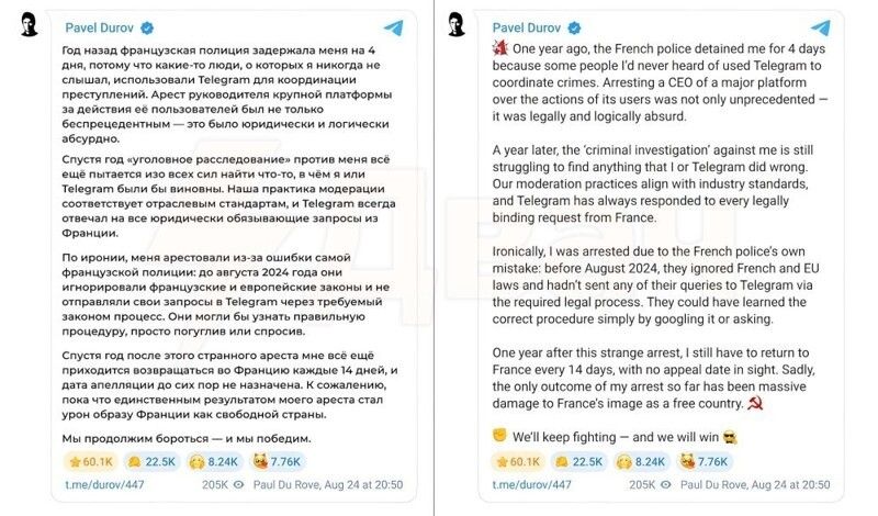 Помимо этого, Дуров раскритиковал правоохранительную систему страны. Он уверен, что его задержание произошло исключительно из-за некомпетентности силовиков, которые до августа 2024 года игнорировали законы ЕС, а затем проснулись и решили арестовать, при этом не потрудившись разобраться с юридической процедурой ЕС, которая предписывает направлять сначала официальные запросы компаниям. "Они могли бы узнать о правильной процедуре, просто погуглив или спросив. Спустя год после этого странного ареста я по-прежнему вынужден возвращаться во Францию каждые 14 дней, и дата подачи апелляции не назначена. <...> Наши методы модерации соответствуют отраслевым стандартам, и Telegram всегда реагировал на каждый юридически обязывающий запрос из Франции" - добавил Дуров.