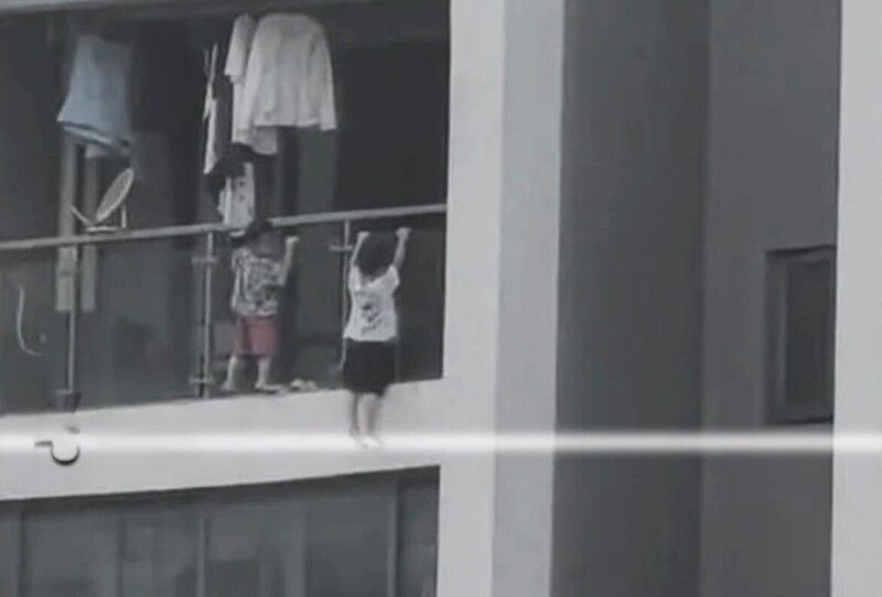 На записи видно, как двое детей держатся за перила, стоя на 13-м этаже здания. Спустя несколько мгновений мальчик поднимает ноги и пытается подтянуться на руках.