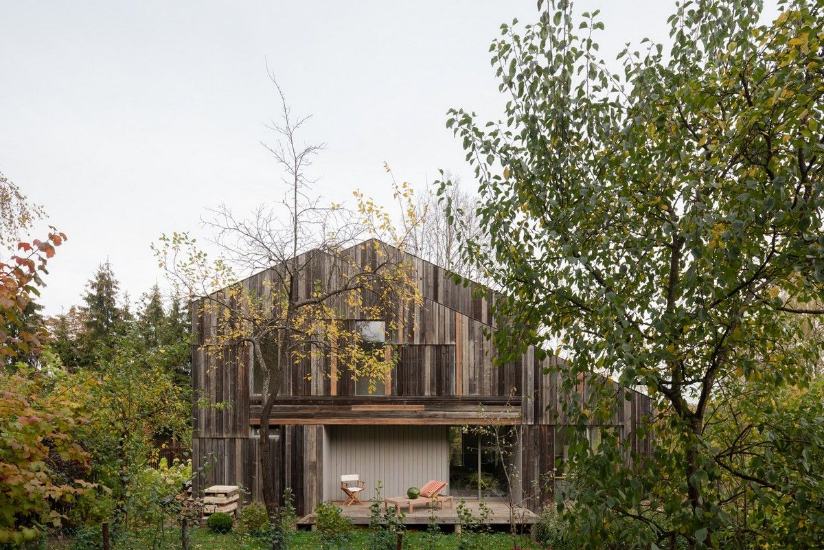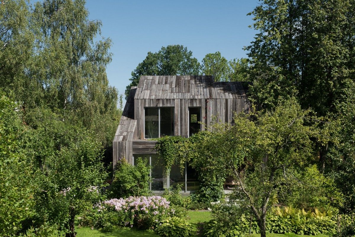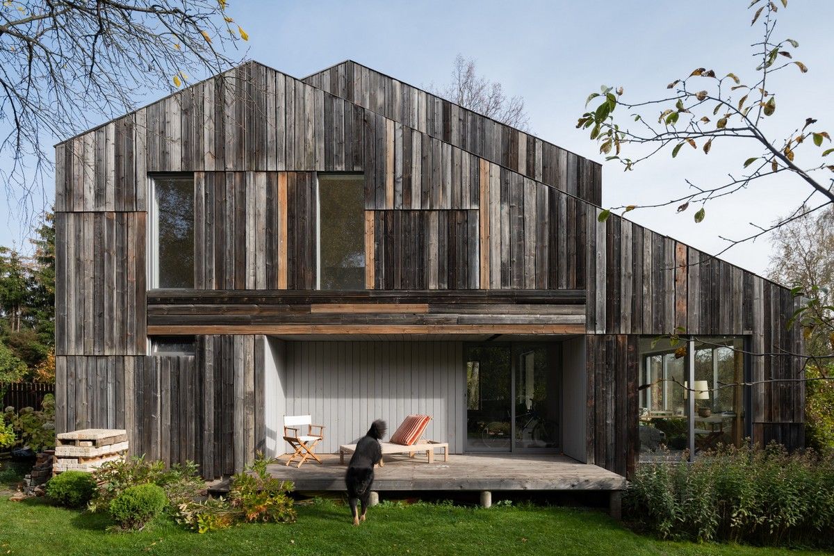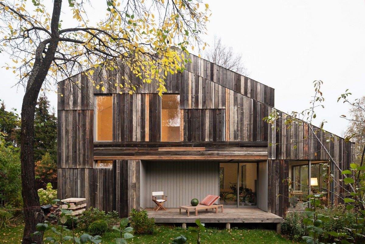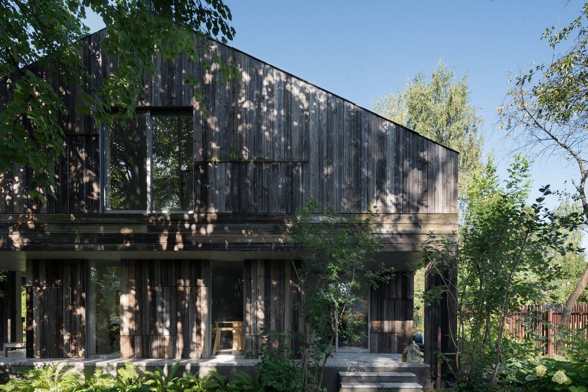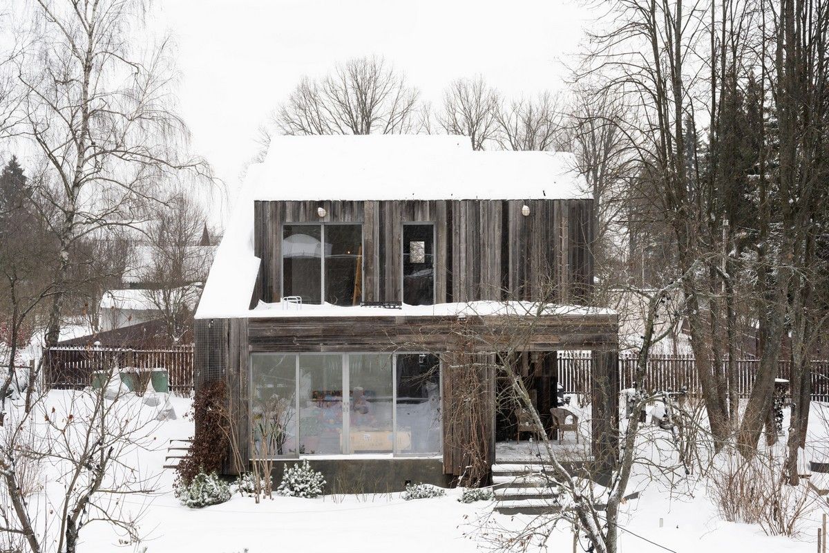 Простота и глубина сложившегося посёлка в пригороде Москвы притягивала своей гармонией и однородностью. Применение на фасаде дома вторичной доски столетнего возраста, привезённой с Севера России, скорее, гротеск в стремлении слиться с природой местности, но в реальности это имело нужный эффект.