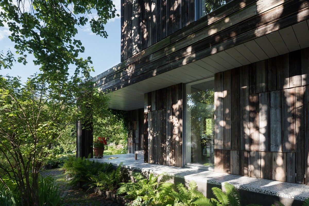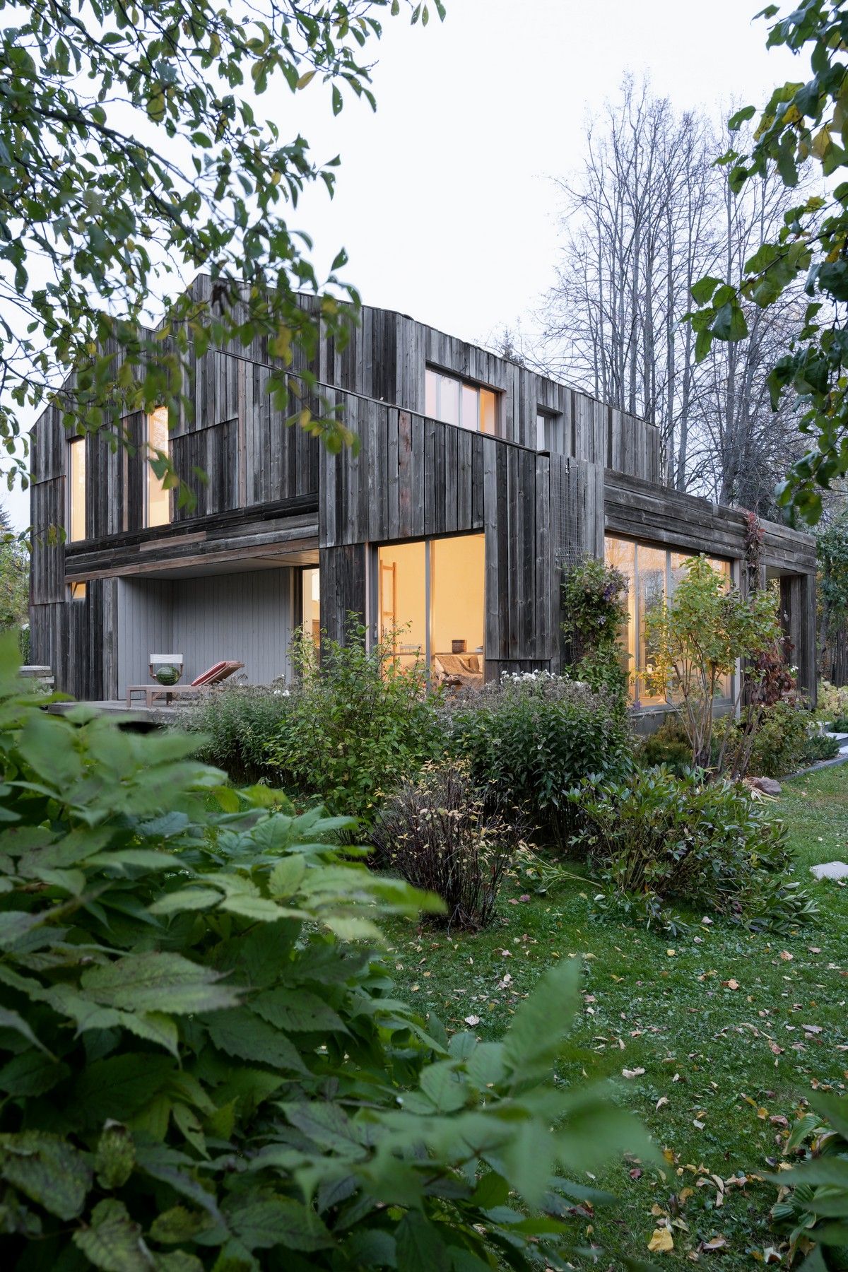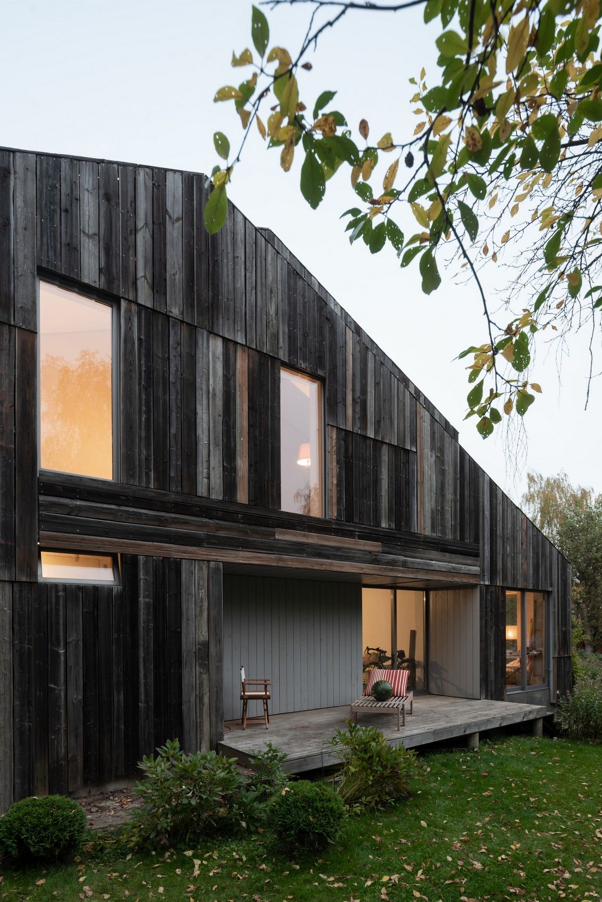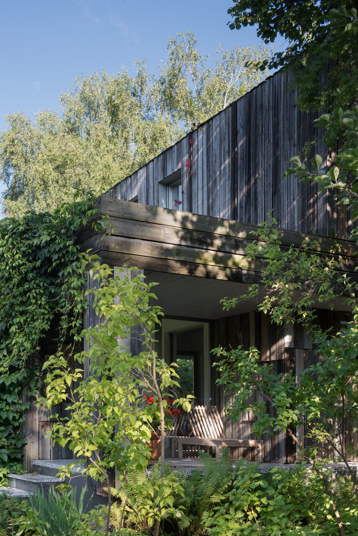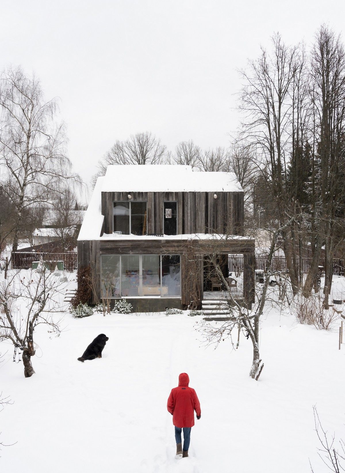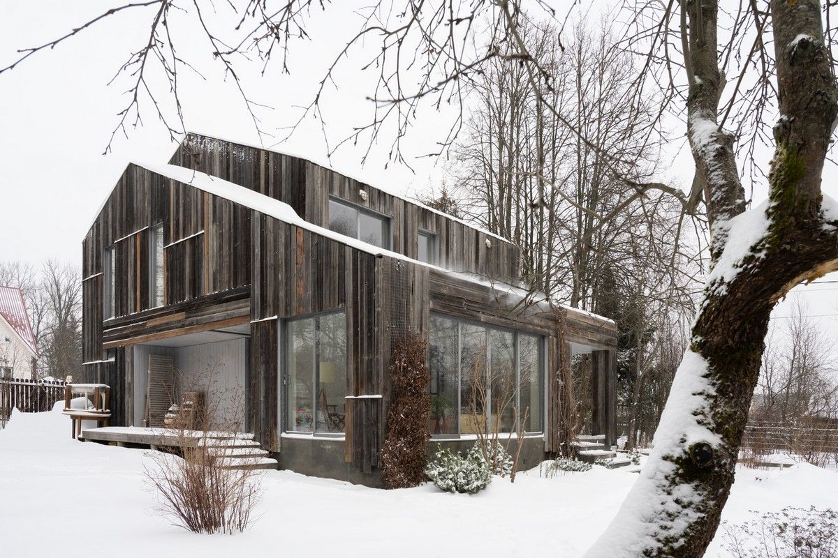 Простота и глубина сложившегося посёлка в пригороде Москвы притягивала своей гармонией и однородностью. Применение на фасаде дома вторичной доски столетнего возраста, привезённой с Севера России, скорее, гротеск в стремлении слиться с природой местности, но в реальности это имело нужный эффект.