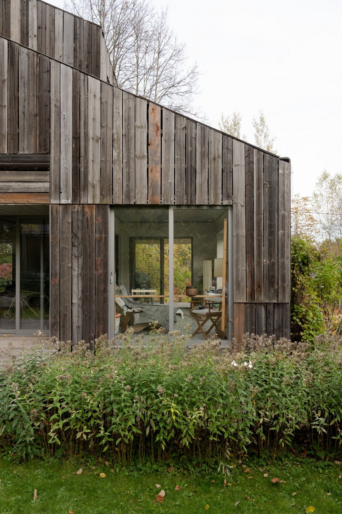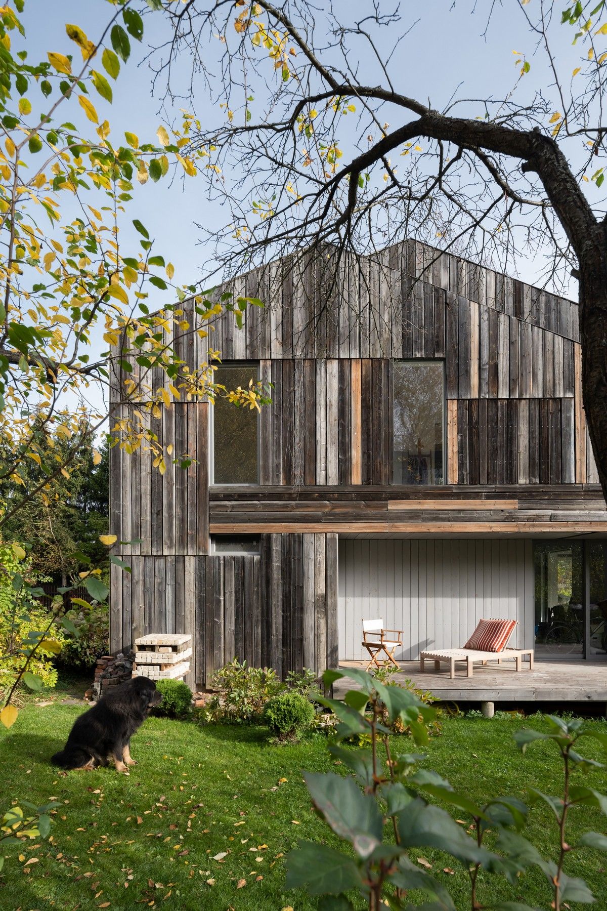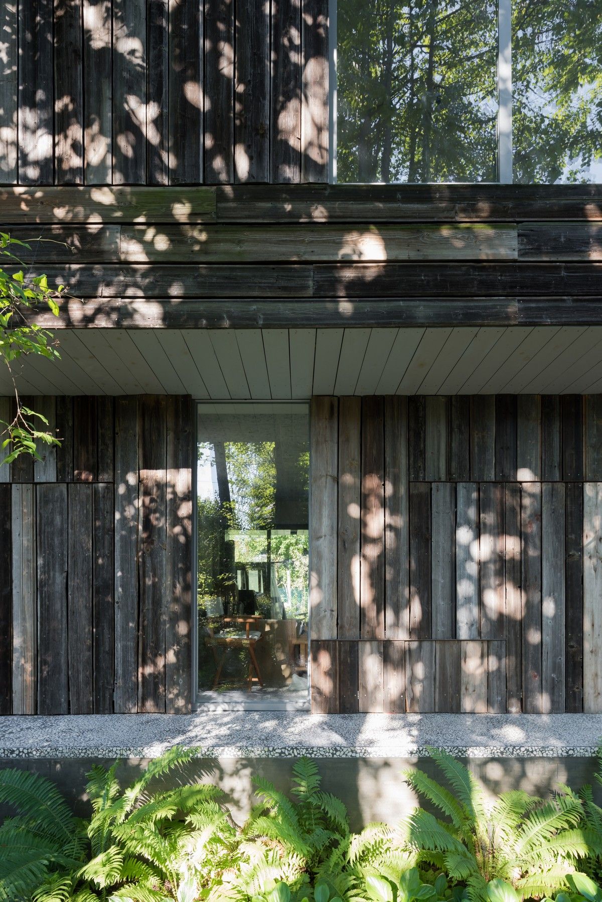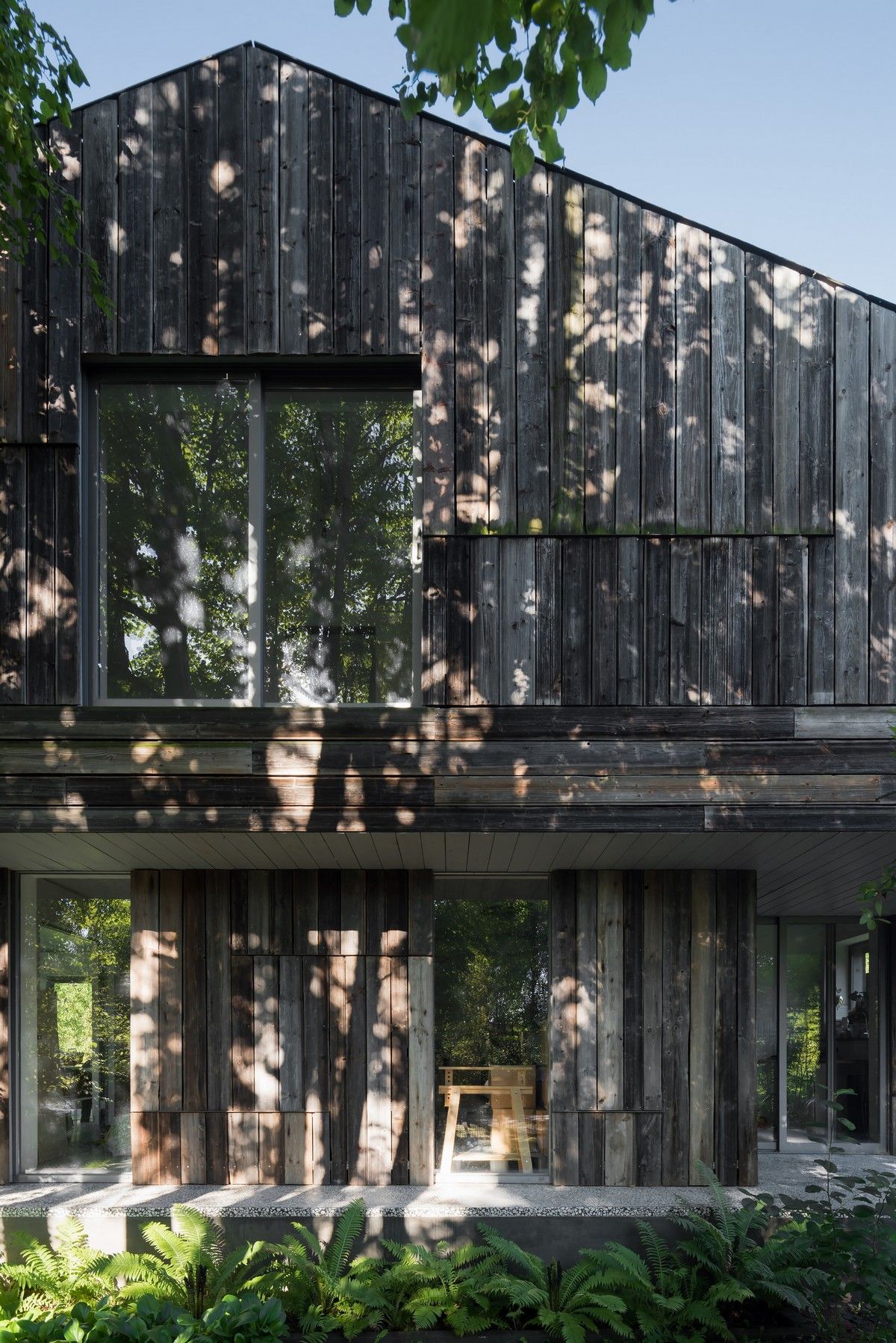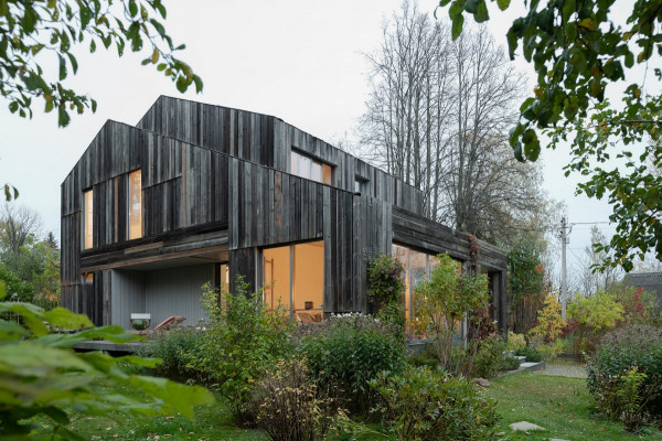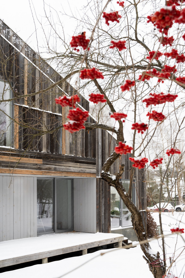 Простота и глубина сложившегося посёлка в пригороде Москвы притягивала своей гармонией и однородностью. Применение на фасаде дома вторичной доски столетнего возраста, привезённой с Севера России, скорее, гротеск в стремлении слиться с природой местности, но в реальности это имело нужный эффект.